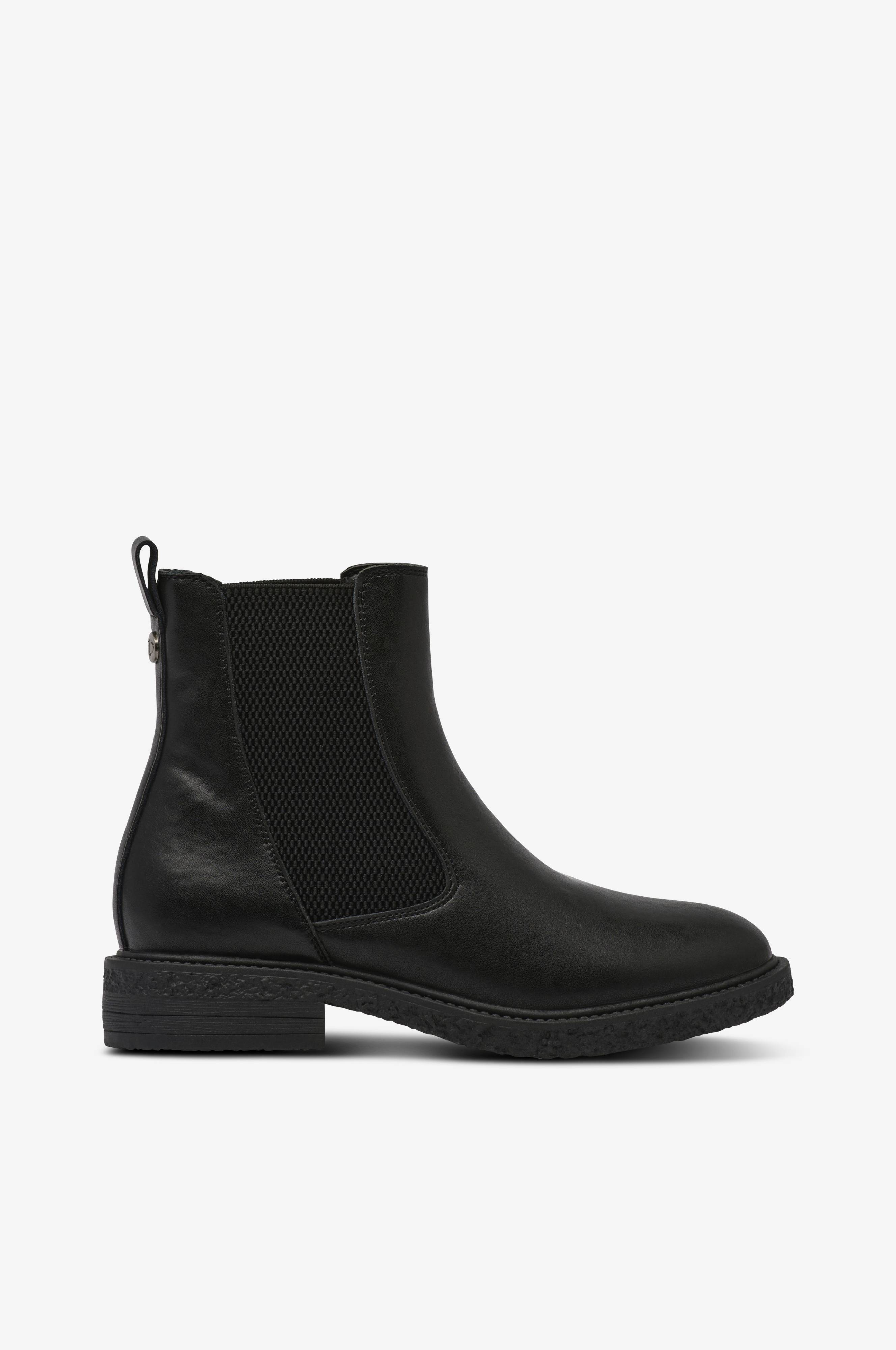 • Boots i skinn med litt spiss tåform• Elastiske paneler på begge sider av skaftet• Draflik bakpå• Tekstilfôr• Yttersåle i gummi• Skafthøyde: 13 cm i størrelse 37