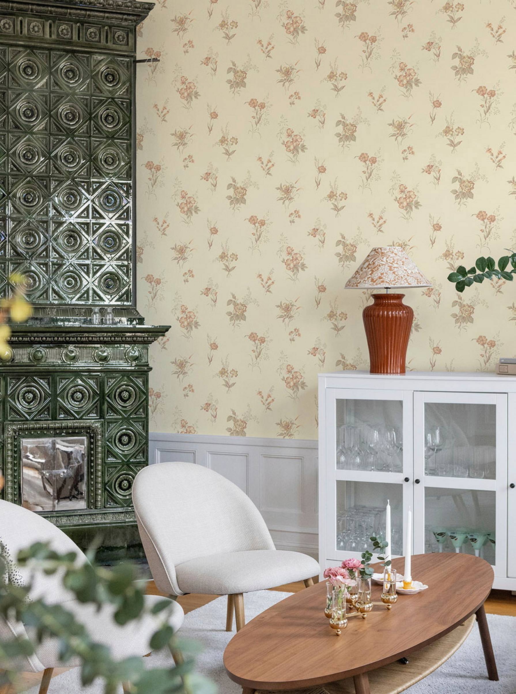 Amalia er et tapet som inviterer ro og mykhet inn i rommet. De klassiske blomsterbukettene har et romantisk uttrykk, men med en letthet som gjør at de passer i alle rom, fra soverom til stue. Mønsteret har en grasiøs rytme, som om hver blomst var plassert med forsiktig hånd. Det er et tapet som skaper atmosfære snarere enn å kreve oppmerksomhet, en mild tilstedeværelse i bakgrunnen, alltid der, alltid vakker.