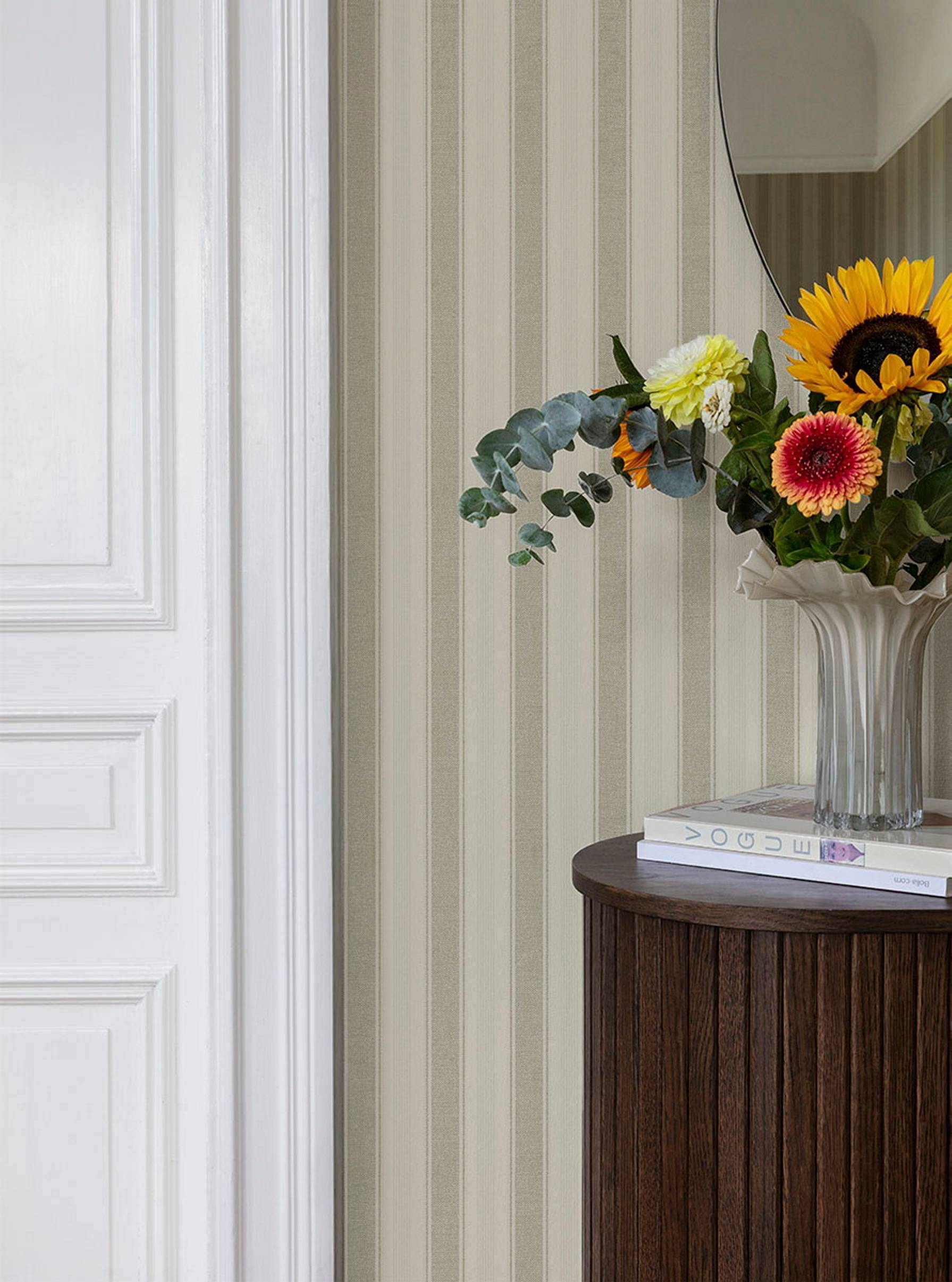 Erik er et stripete tapet med en tekstillignende følelse som gir en rolig og behagelig atmosfære i ethvert rom. Stripene er klassiske, men likevel myke, noe som gir mønsteret en livlig og naturlig karakter. Tapetet er tilgjengelig i seks fargevarianter, hver med sin egen varme tone. Erik passer perfekt i stuer, soverom og korridorer, og skaper en subtil rytme som får ethvert rom til å føles innbydende og behagelig.