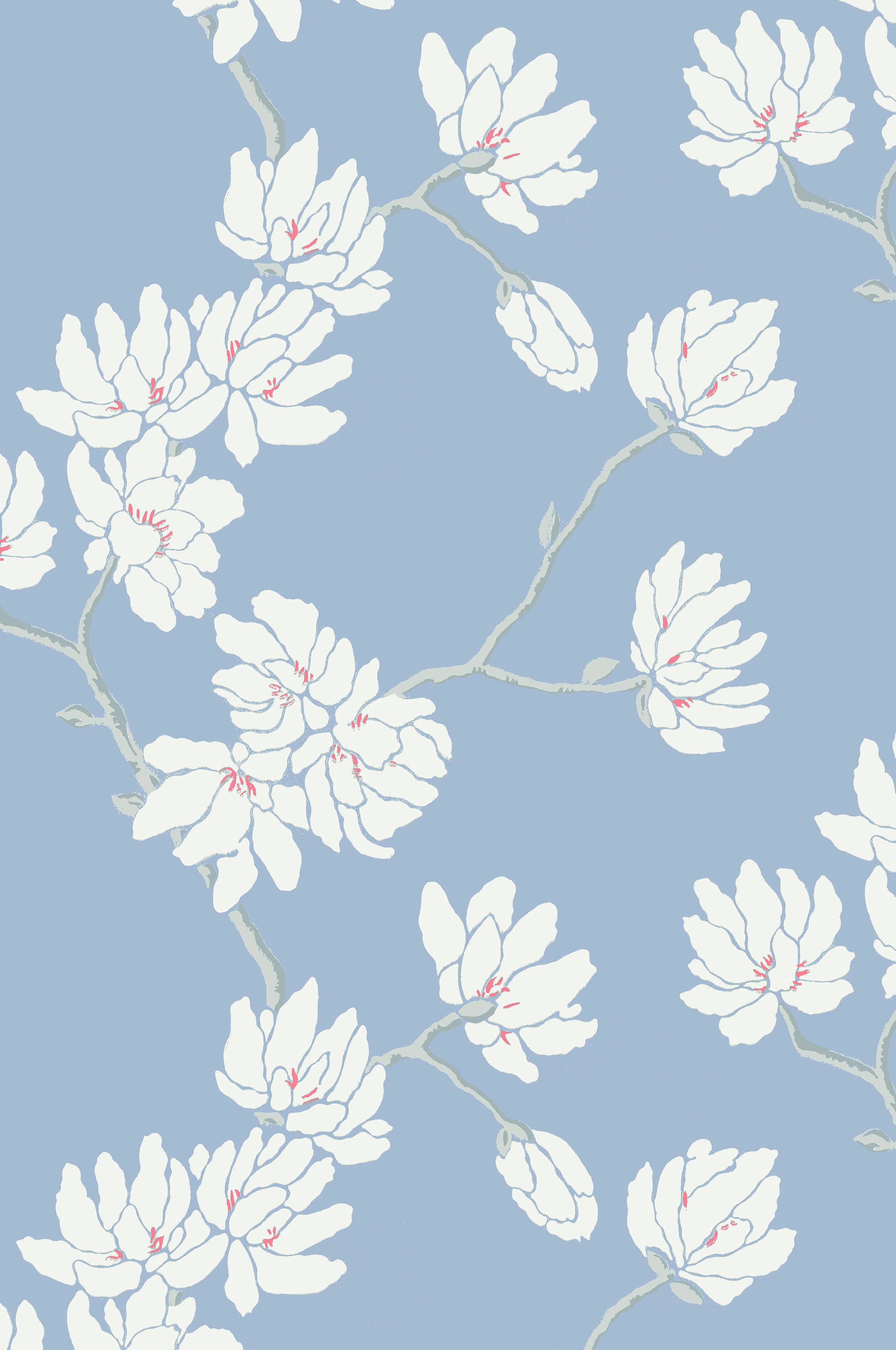 Tapet Praktmagnolia blå bestiller du på artikkelnummer 1051343-01-0. Tapetet leveres i rull med lengde 10,05 m og bredde 53 cm.