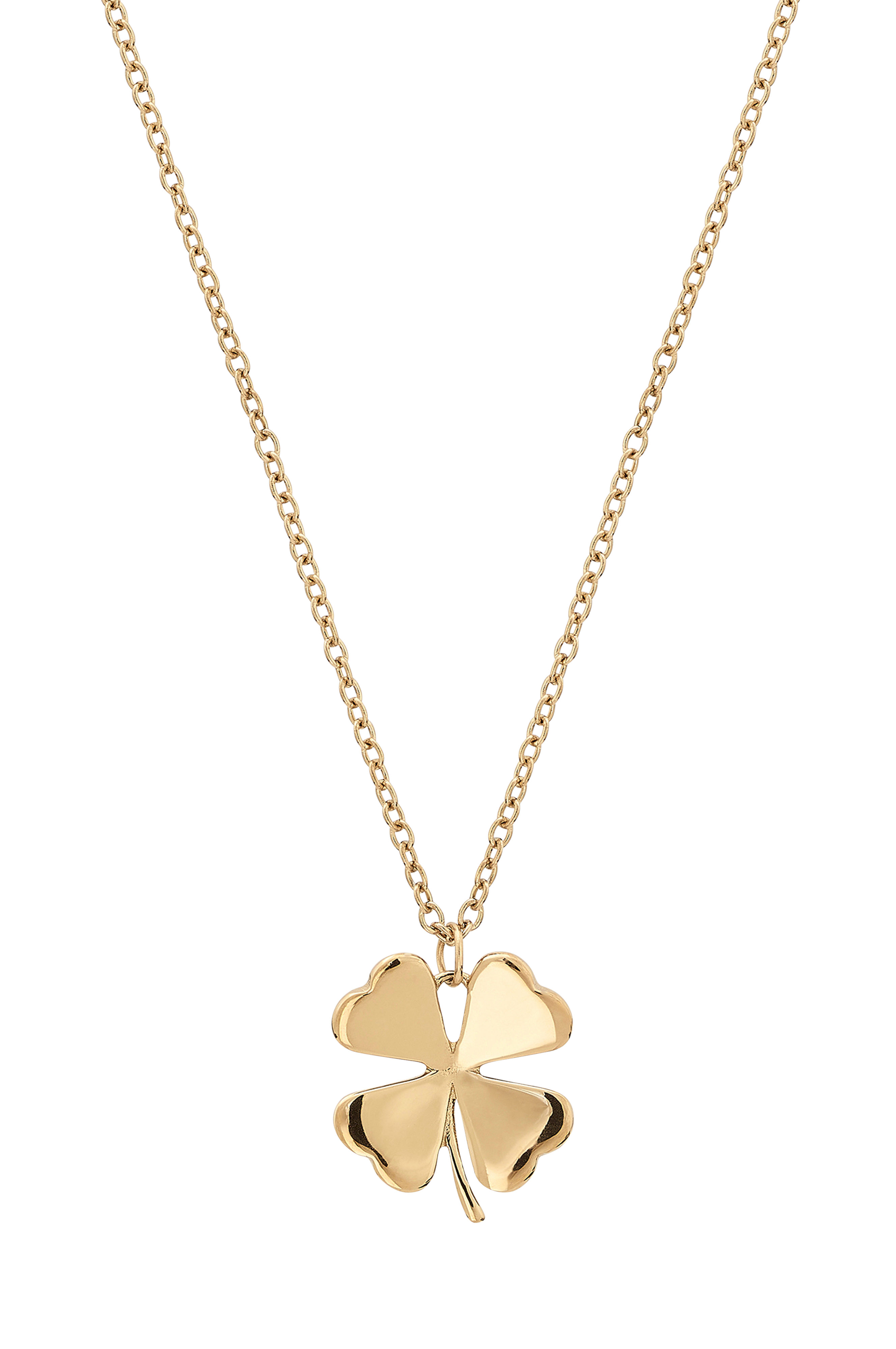Halskjede men nett ankerkjede og anheng i form av en firkløver. Blankt 14K gullplettering på rustfritt stål. Nikkelfritt.Diameter firkløver 12 mm.Lengde kjede 42-45 cm.