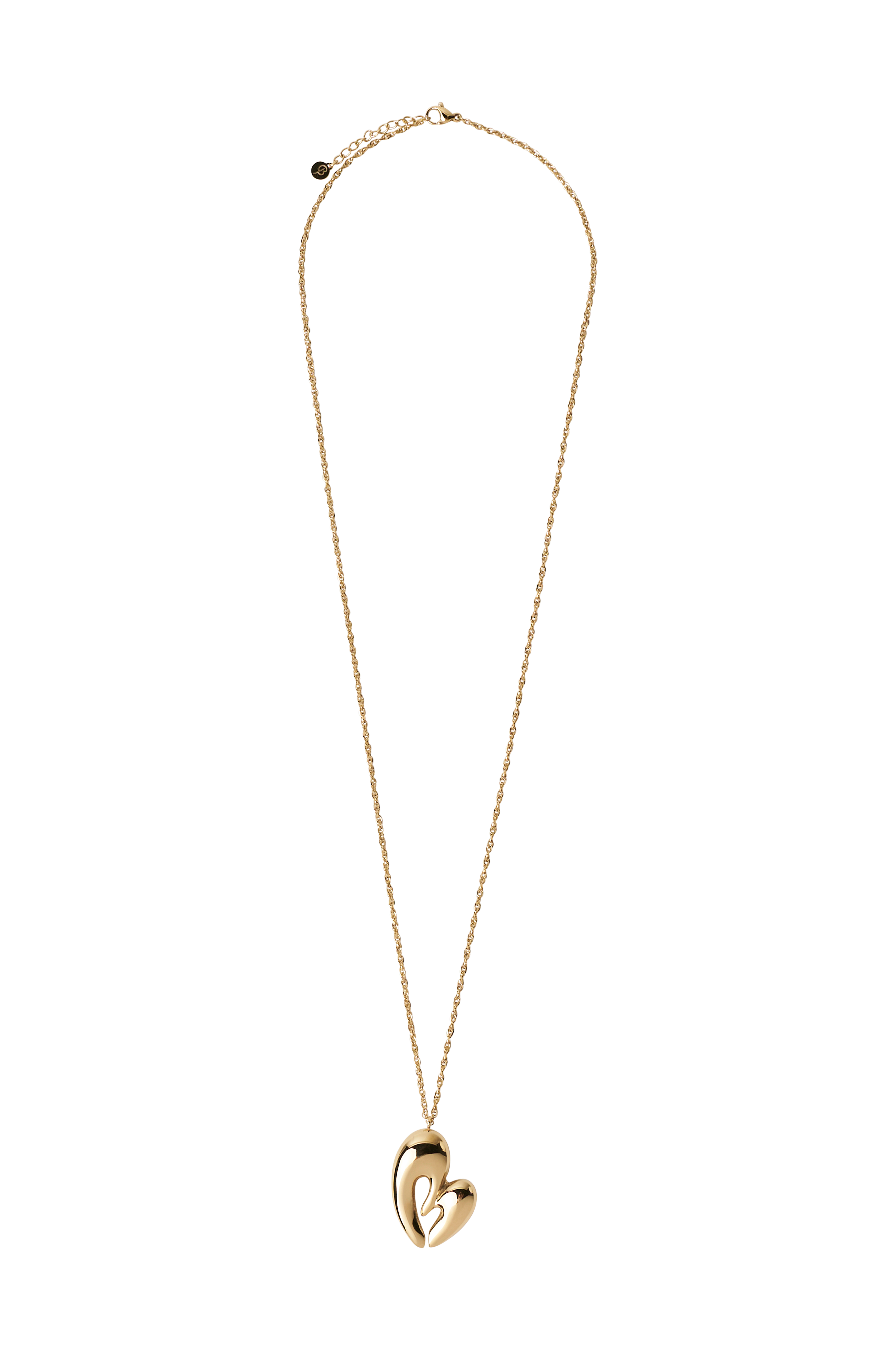 Langt halskjede med stort hjerte som henger i et rolokjede. Blank 14K gullplettering på rustfritt stål. Mål 31 X 24 cm. Halskjedets justerbare lengde 60-63 cm. Nikkeltestet.
