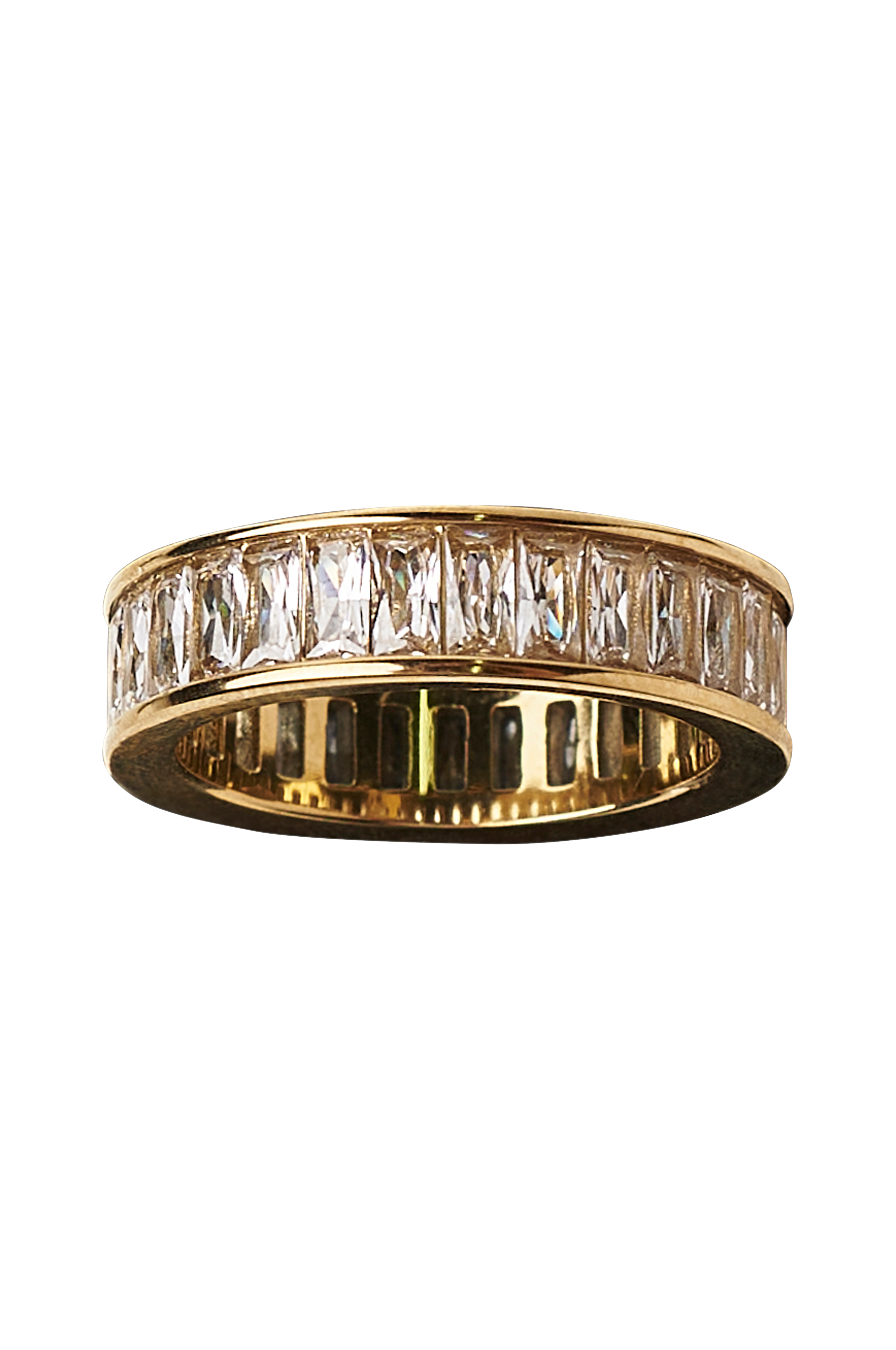 Radiant ring har vakre avlange steiner rundt hele ringen og innfatning som lar lyset lyse gjennom. Radiant ring blir en favoritt som du bruker både til hverdags og fest. Bredde 5 mm, høyde 2 mm. Blank 14K gullplettering på rustfritt stål. Nikkeltestet.