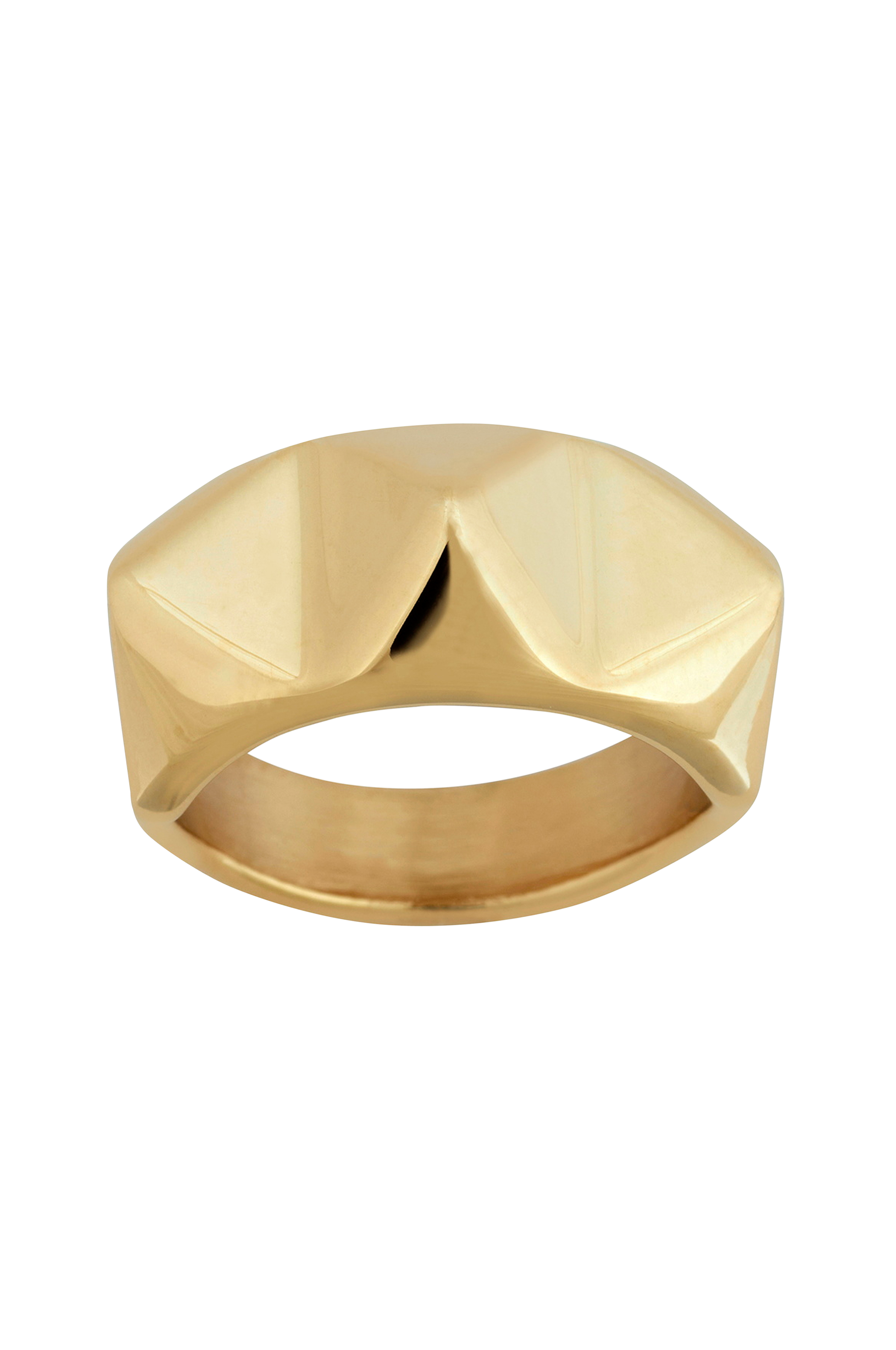 I serien Peak kommer her en litt bredere modell av ringen med mer firkantede, myke nagler.Materiale: Blank 14K gullplettering på rustfritt stål.Mål: Høyde 6 mm, bredde 10 mm.Nikkeltestet.