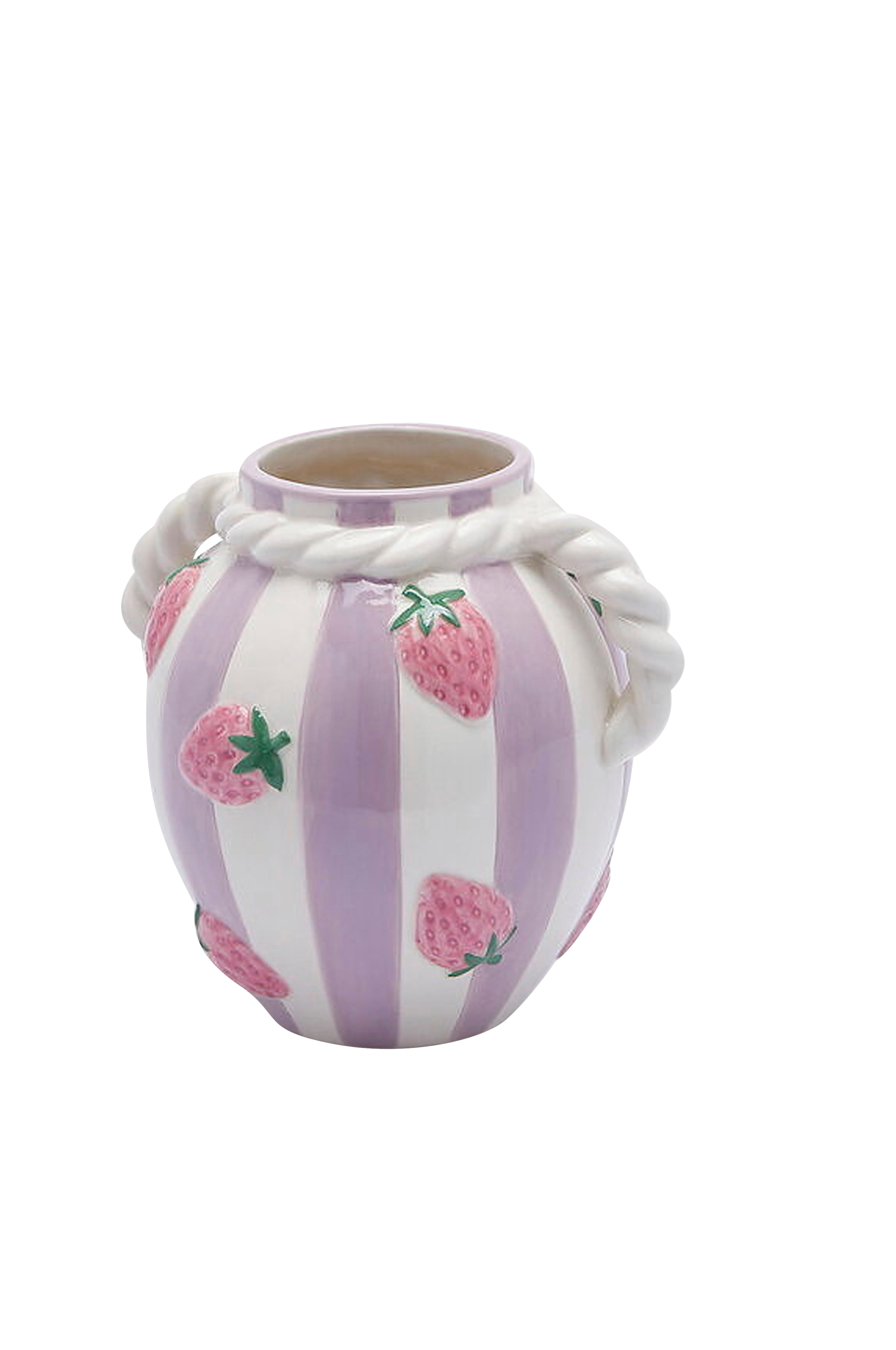 Denne keramiske vasen, prydet med levende jordbær, har et sjarmerende håndverk og et friskt, livlig design. Med en høyde på 17 cm og en diameter på 16 cm gir den et søtt og fargerikt preg til ethvert rom.