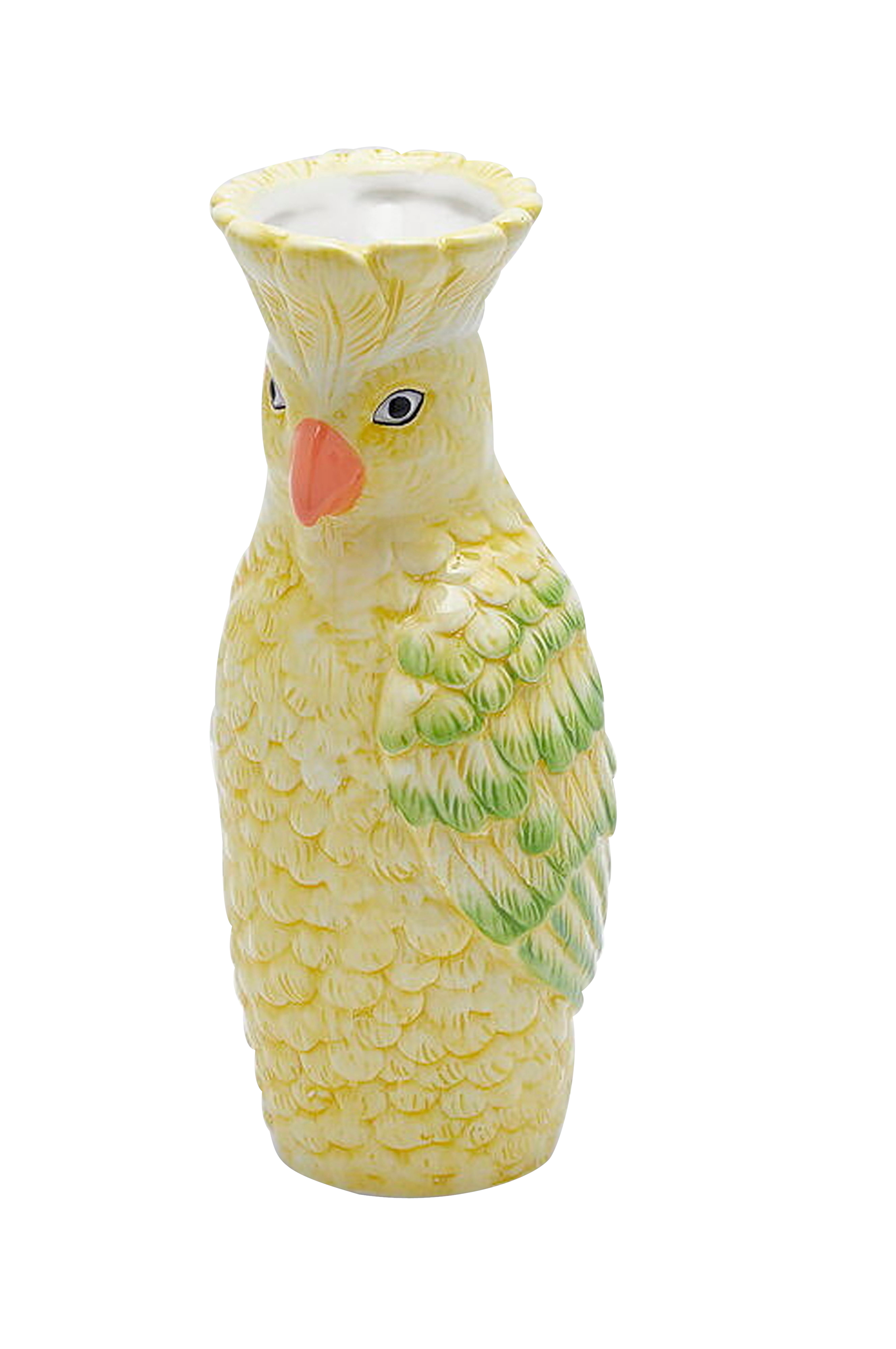 Denne papegøyevasen i keramikk har livlige farger og et detaljert håndverk som gir et lekent og unikt preg til ethvert rom. Med en høyde på 24 cm og en diameter på 11,5 cm er den et iøynefallende og sjarmerende tilskudd til innredningen din.