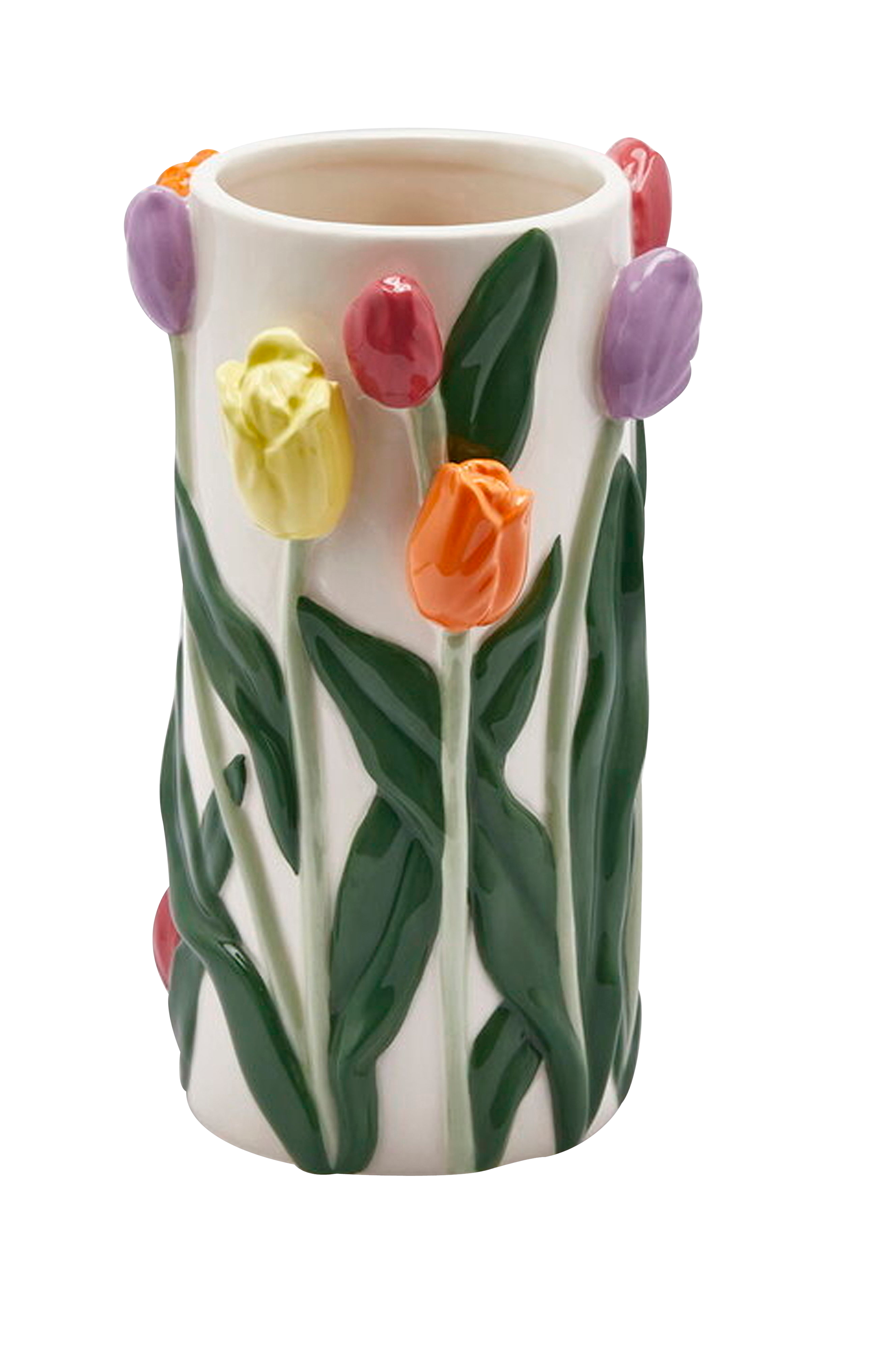 Denne håndlagde keramikkvasen, dekorert med delikate tulipaner, har et intrikat håndverk og en frisk, naturlig design. Med en høyde på 23 cm og en diameter på 14 cm gir den et elegant og sjarmerende preg til ethvert rom.