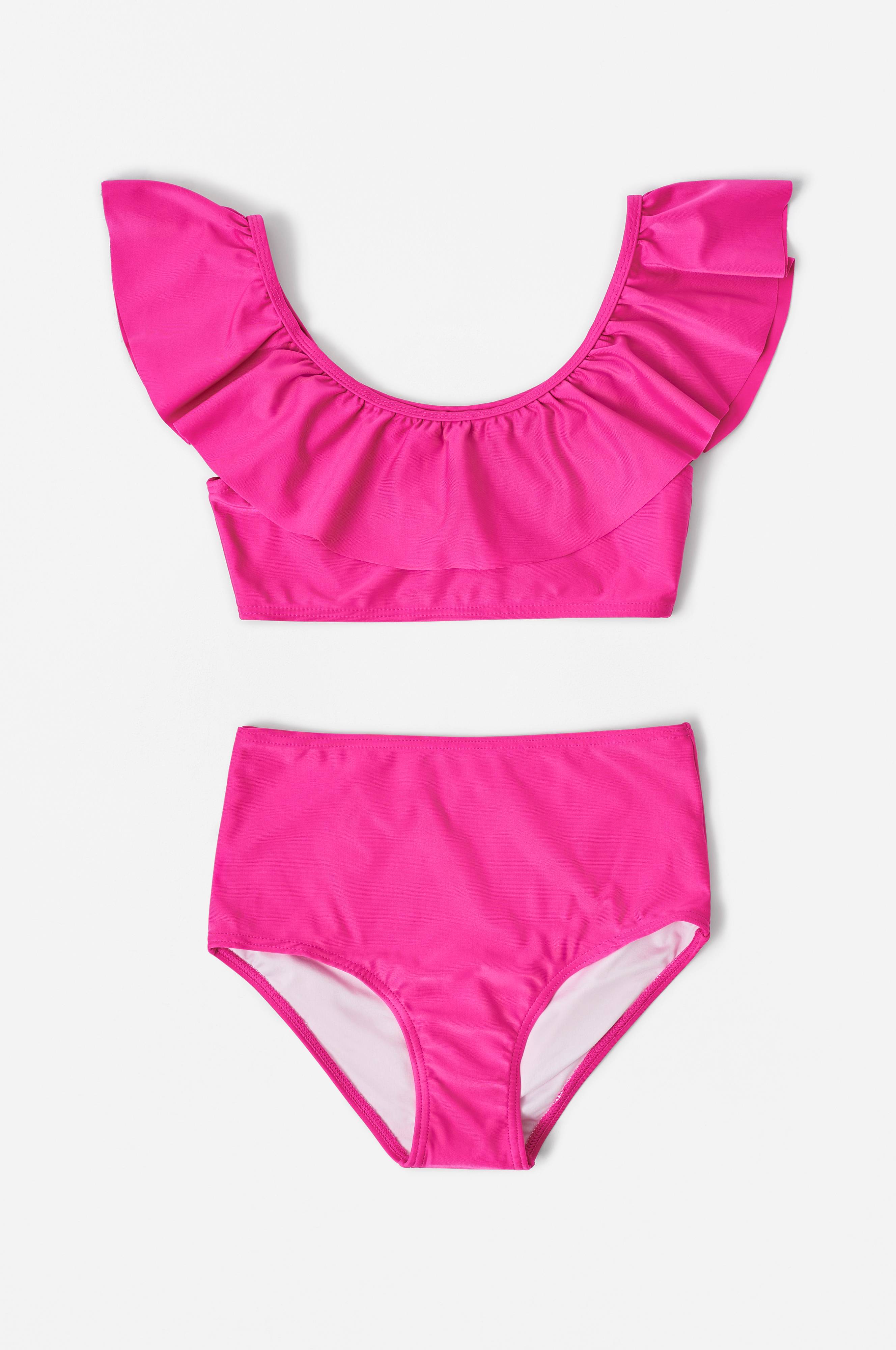 Bikini Noemi i to deler. Bikinitopp med bred volang øverst rundt og smal strikk nederst. Bikinitruse i høy hipstermodell med brede sider. Helfôret.
