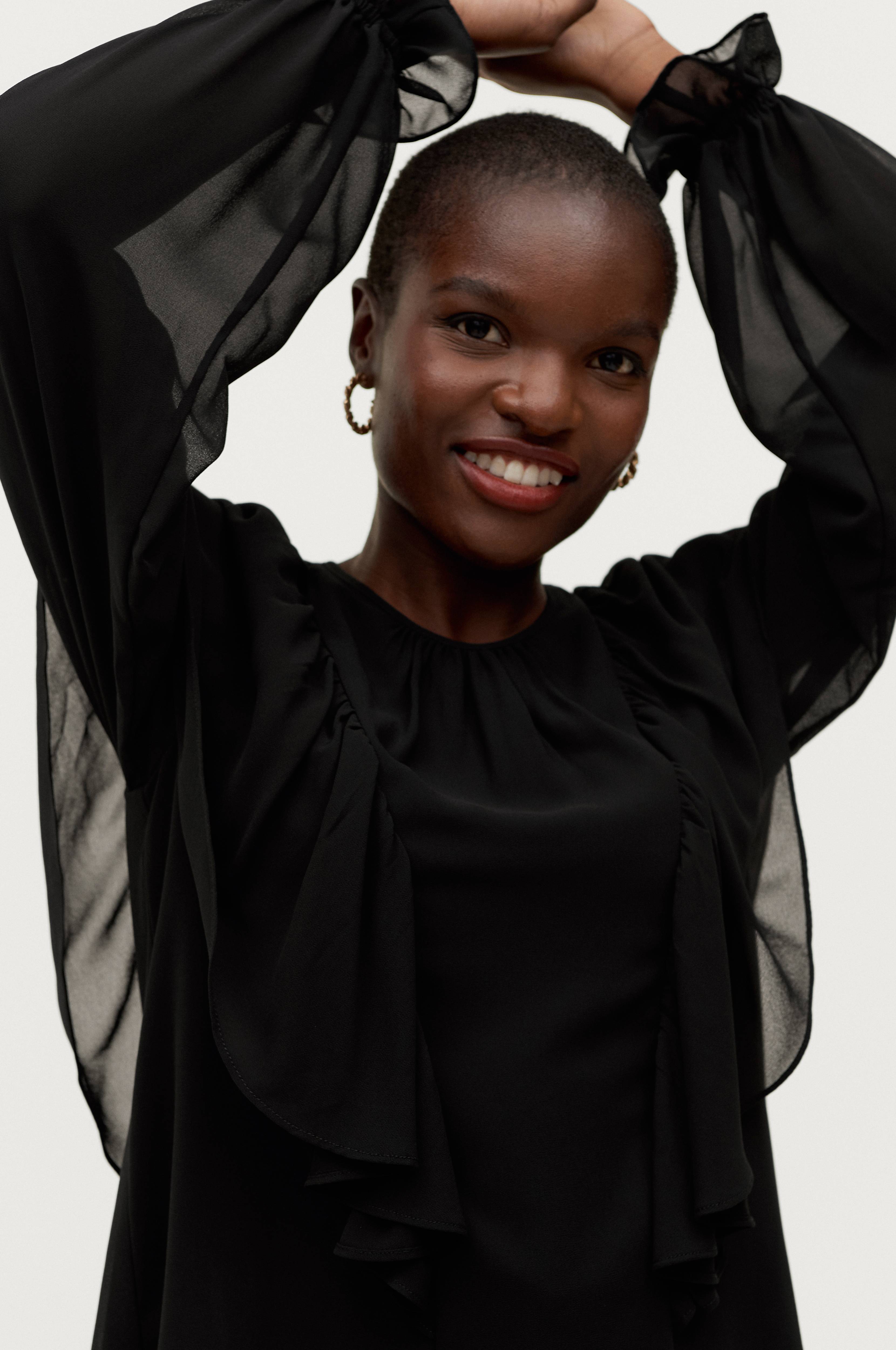 • Brede armer med elastiske mansjetter• Brede volanger foran og bakpå• Rund hals med rynke• Ventilasjon med knapp i nakken• Laget av chiffon• Fôret• Lengde: 65 cm i størrelse 34/36