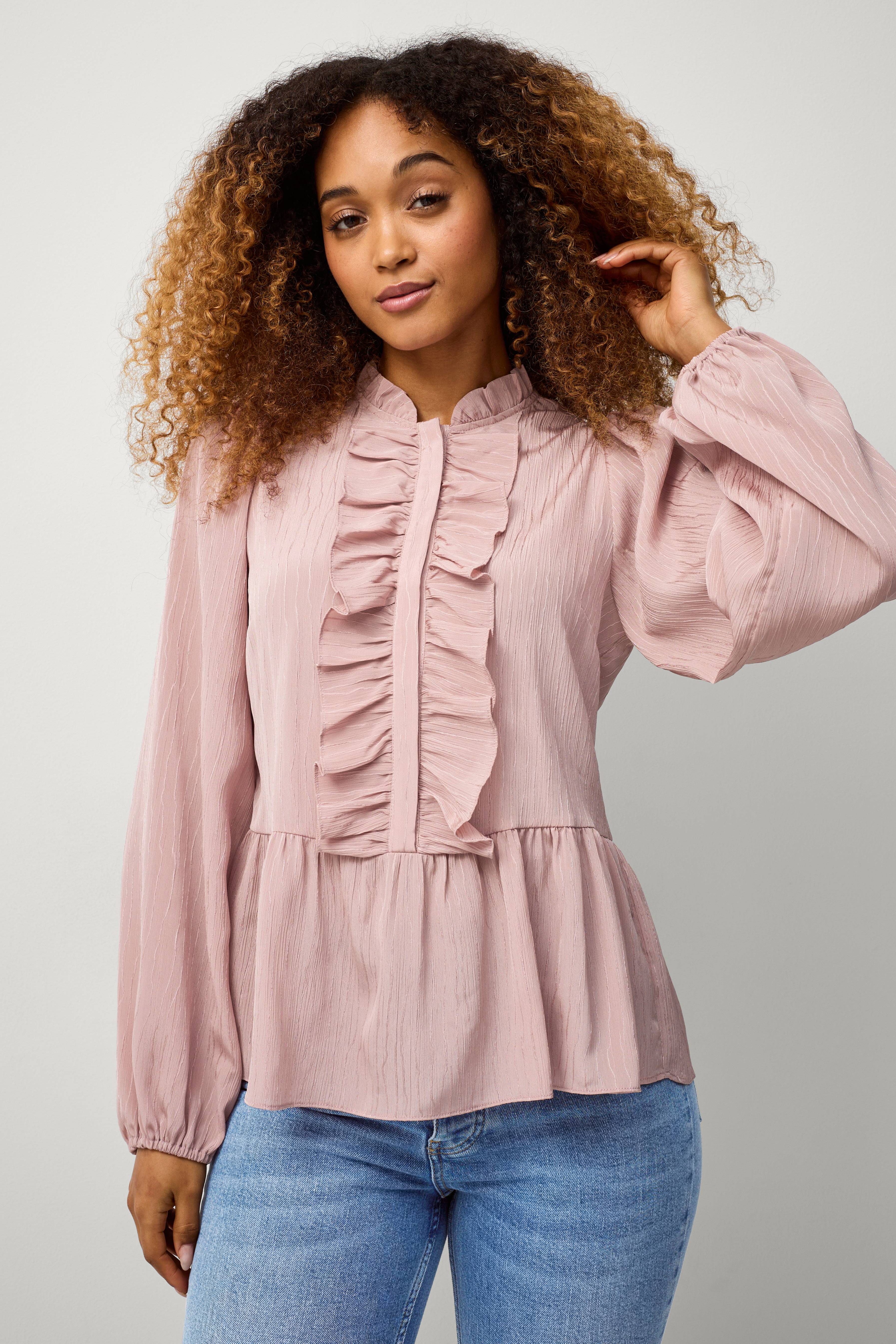 • Volang foran og i halsen • Skjulte knapper • Ballongermer med elastiske mansjetter • Tynn, vevd kvalitet med struktur og lysskinn • Lengde: 63 cm i størrelse 34/36