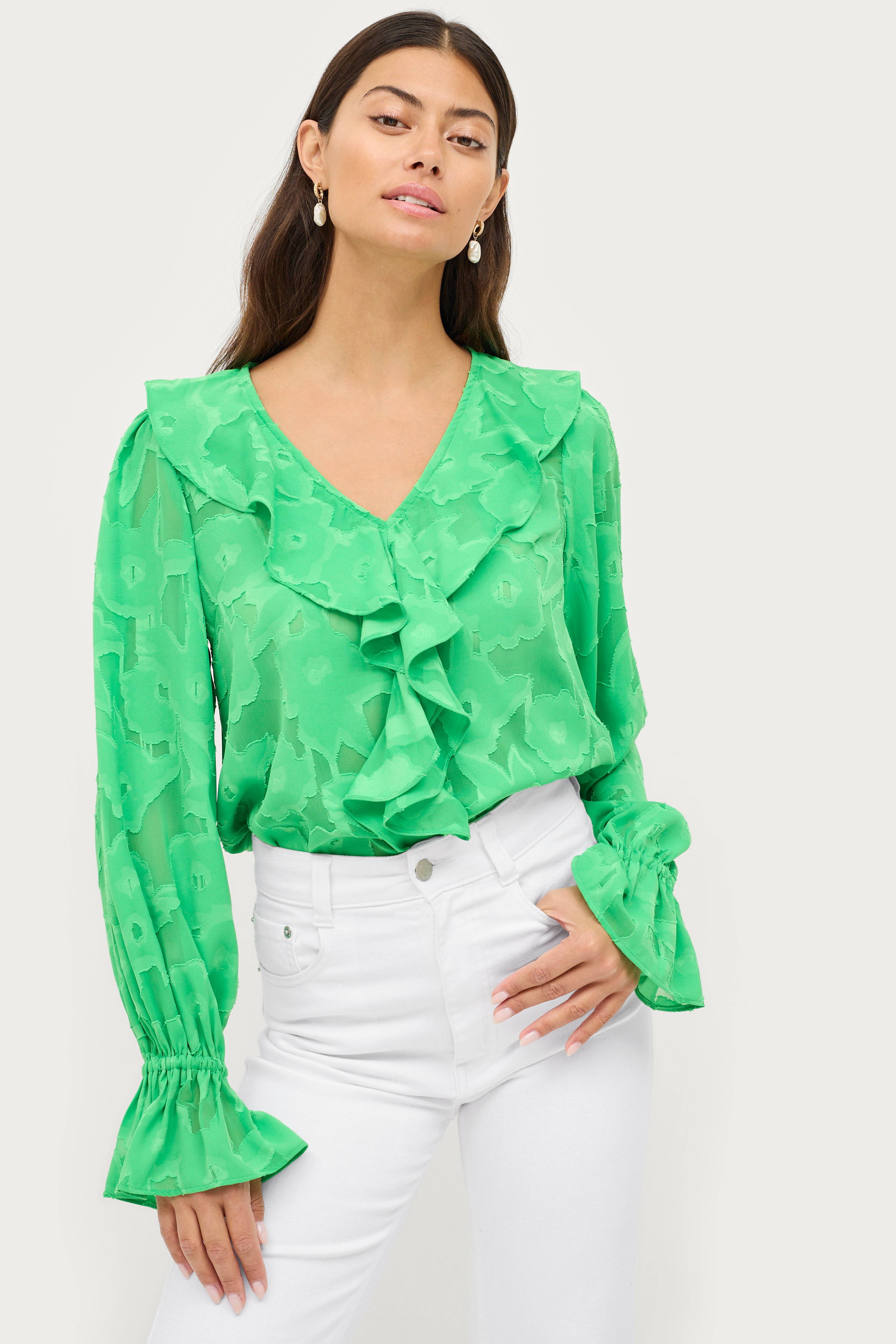 • Gjennomsiktig bluse i chiffon med vevd mønster• V-hals snitt med volang• Ballongermer med volang i ermeslutten• Lengde: 62 cm i størrelse 34/36