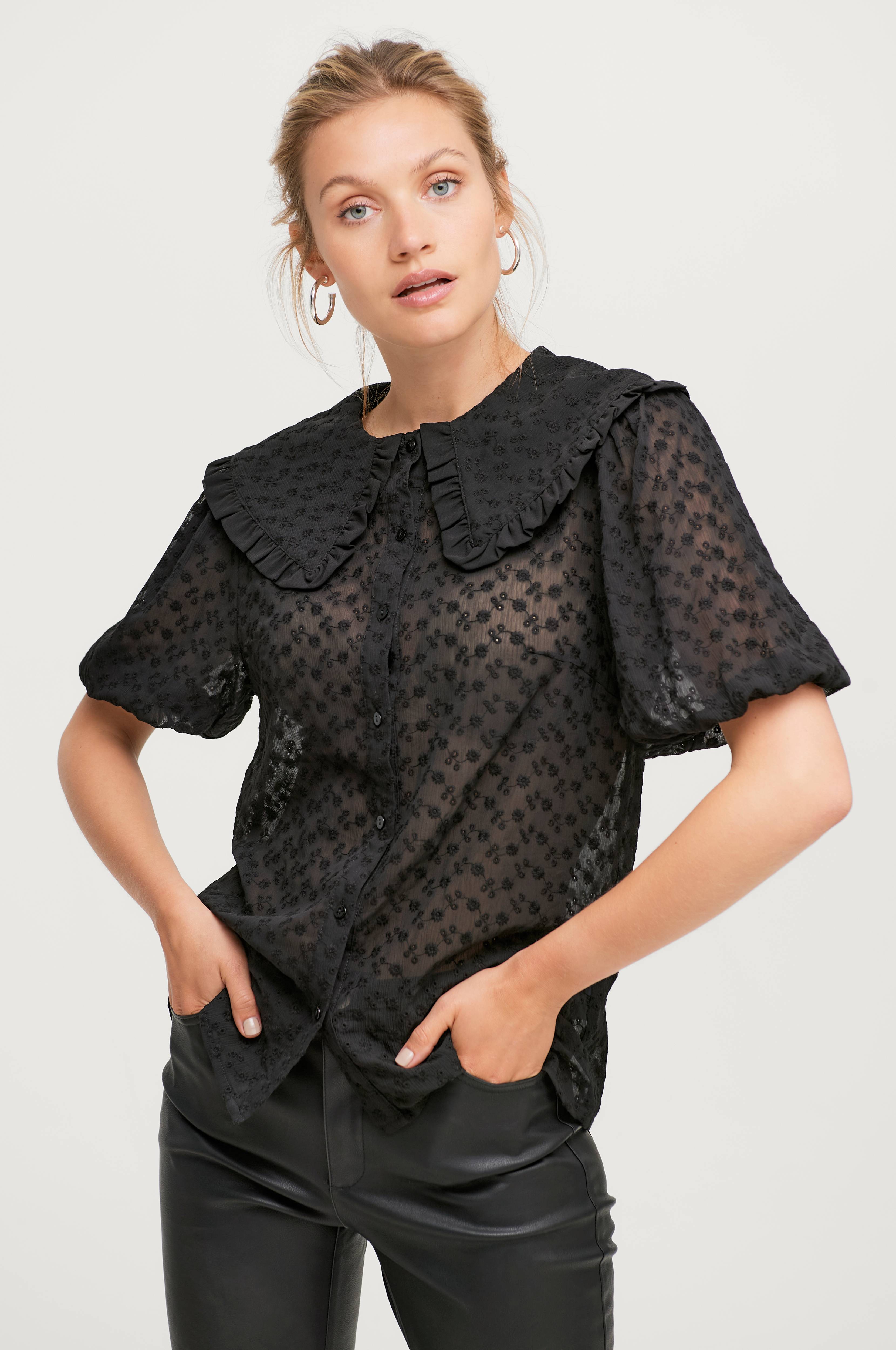 Bluse Fredrika i halvtransparent kvalitet med brodert hullmønster. Knapper foran, bred volangkrage og korte puffermer med elastiske ermekanter. Lengde ca. 66 cm i str 36.