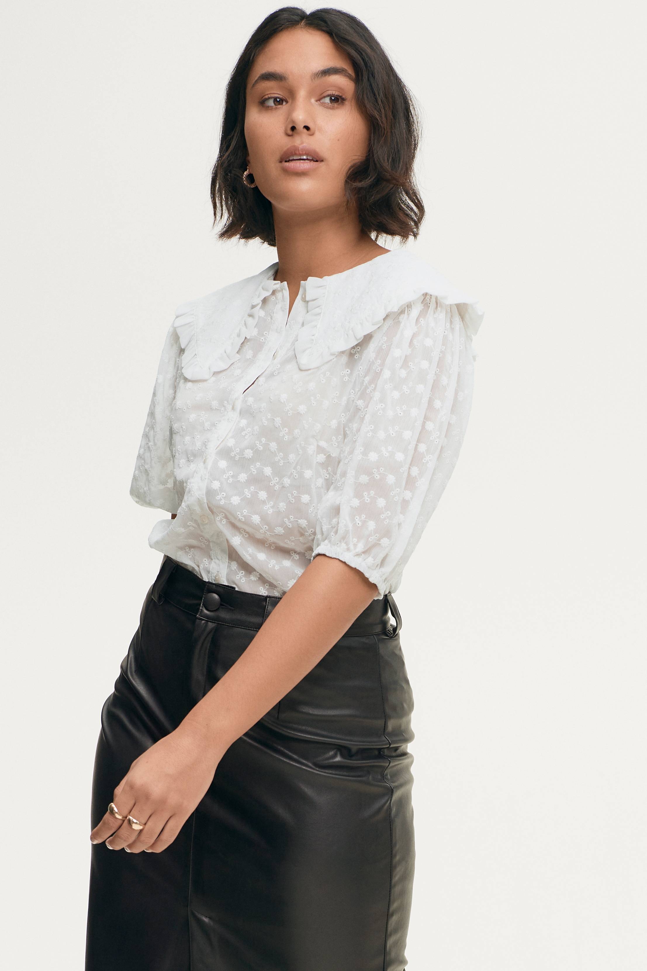 Bluse Fredrika i halvtransparent kvalitet med brodert hullmønster. Knapper foran, bred volangkrage og korte puffermer med elastiske ermekanter. Lengde ca. 66 cm i str 36.
