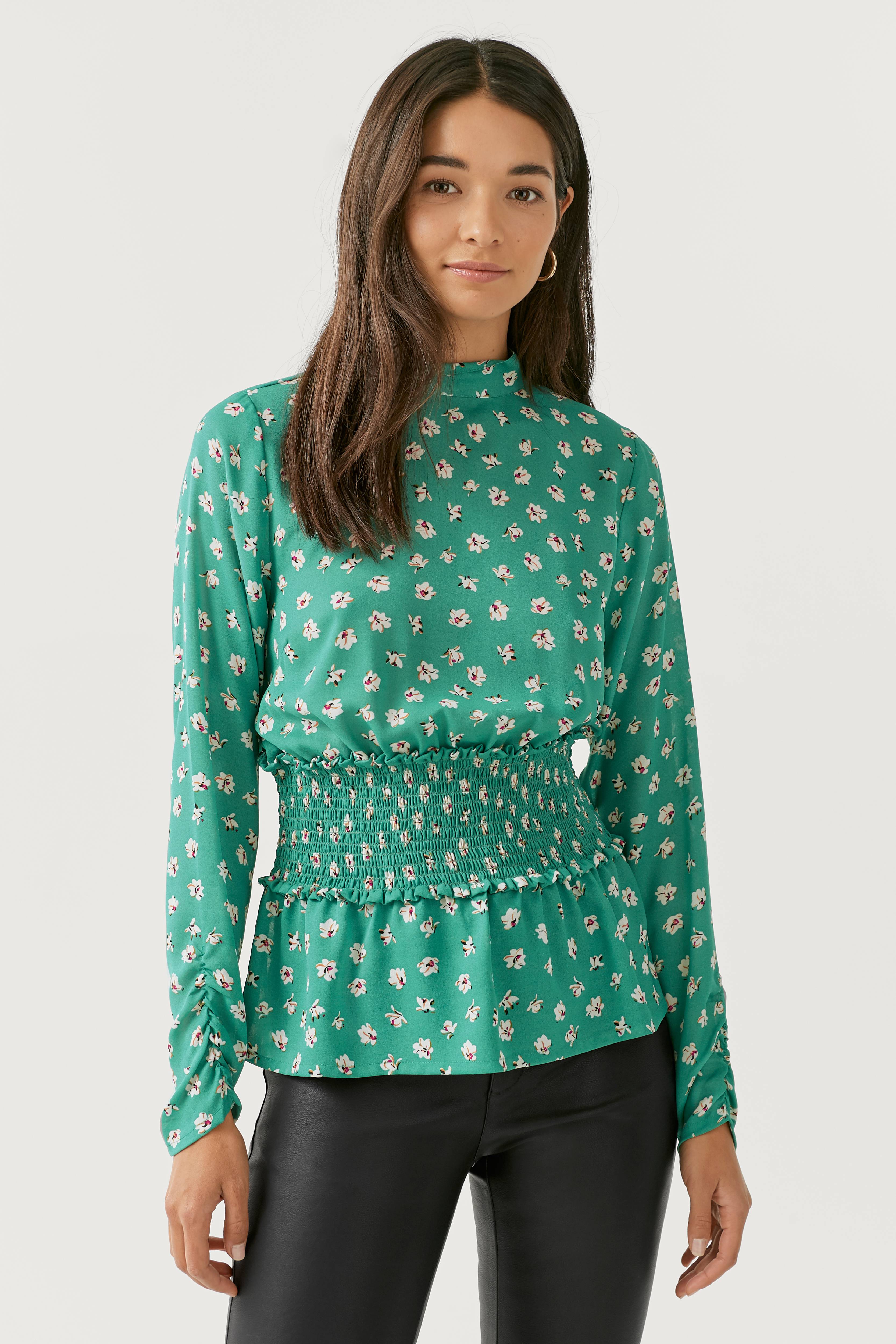 Bluse Gabbi med bred vaffelstrikk i midjen samt lange ermer med elastisk rynke nederst. Liten ståkrage med splitt og to knapper i nakken. Fôret i tynn chiffon. Lengde ca. 64 cm i str 36.