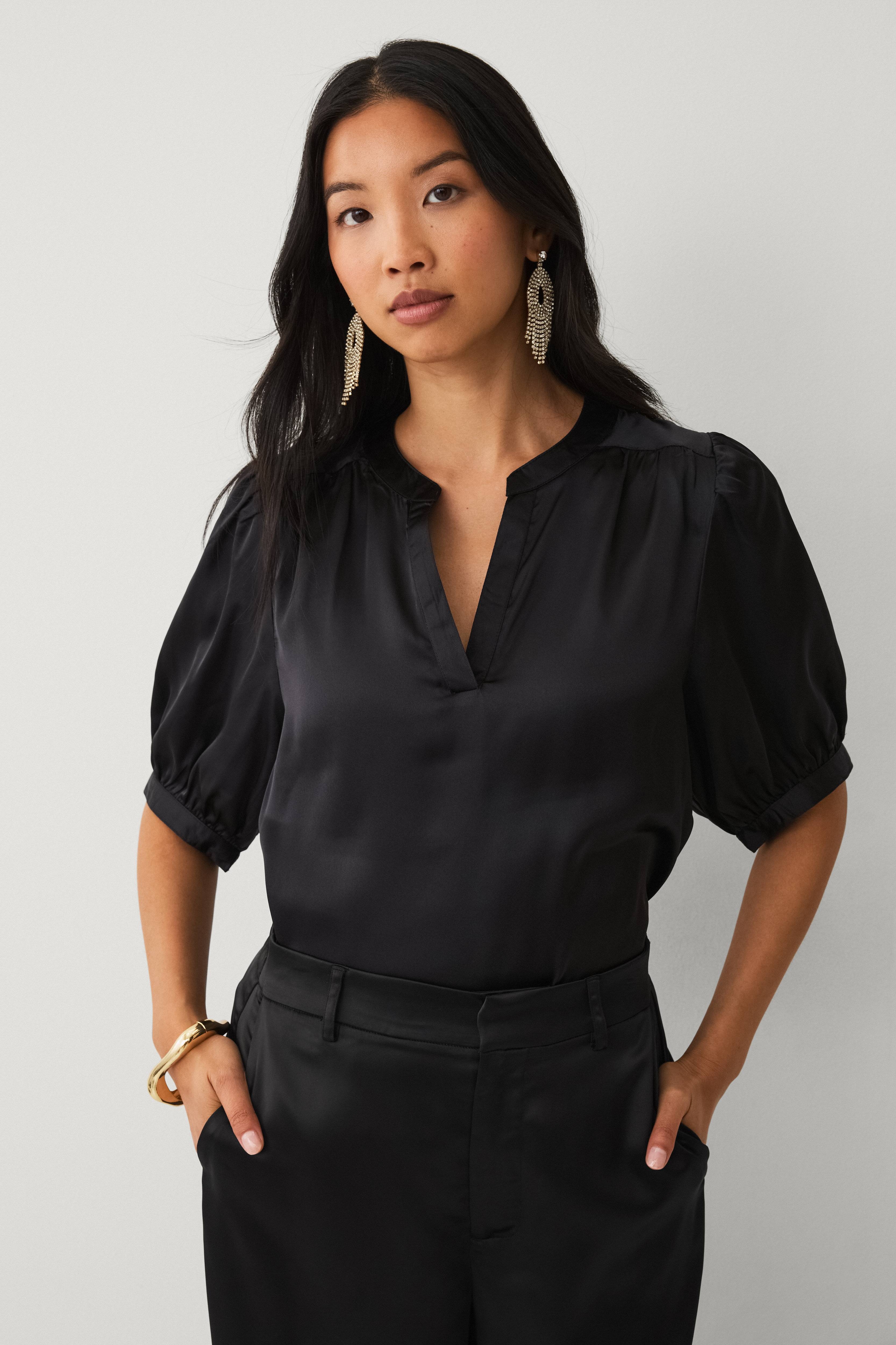 • Skinnende satengbluse• Bobleerme 3/4 lang• Rund hals med skjær foran