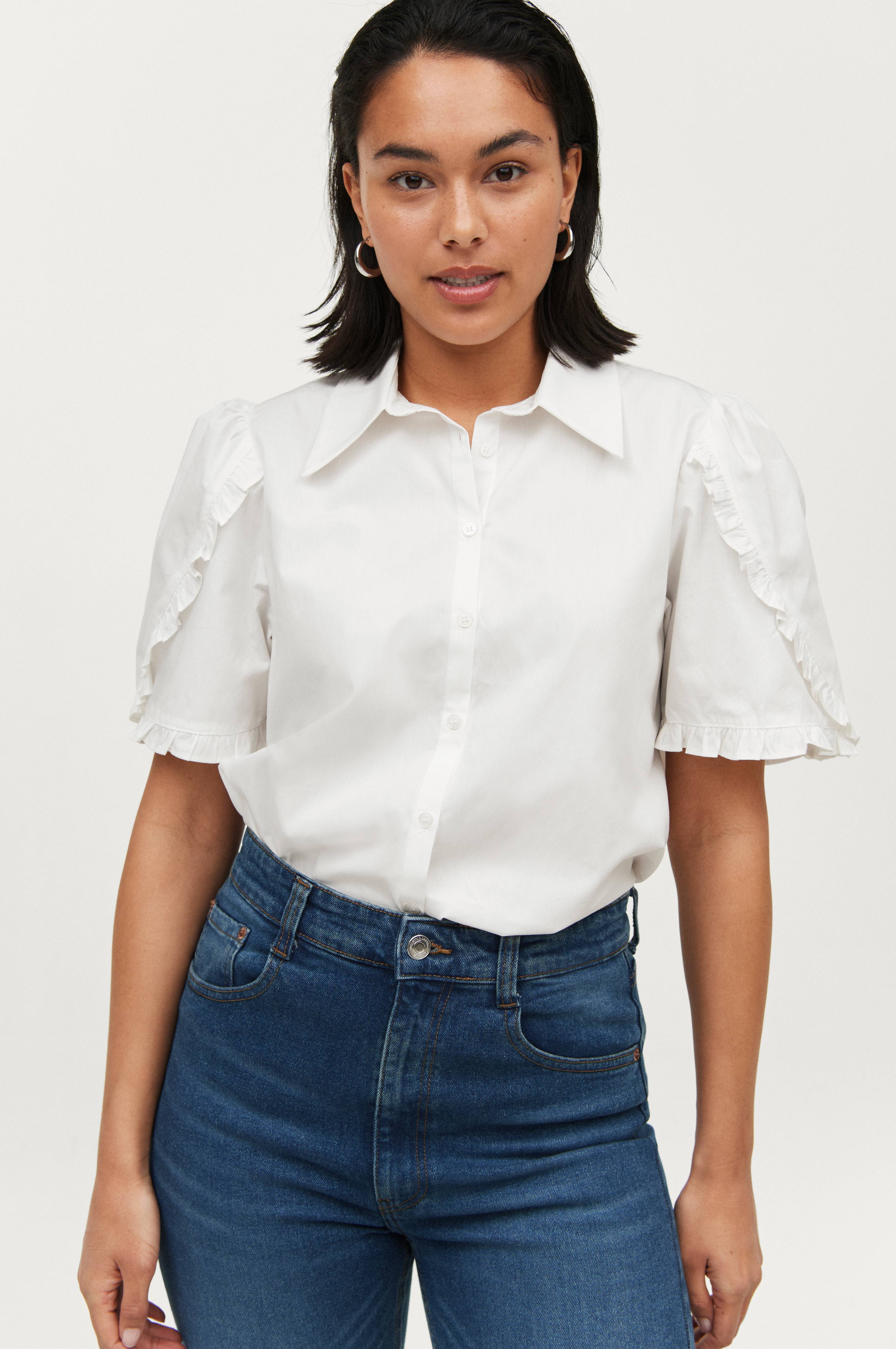 Bluse i vevd, krispet bomullskvalitet. Rett modell med knapper foran og splitt nederst i sidene. Korte, vide puffermer med volanger. Spiss krage. Lengde ca. 63 cm i str 36.