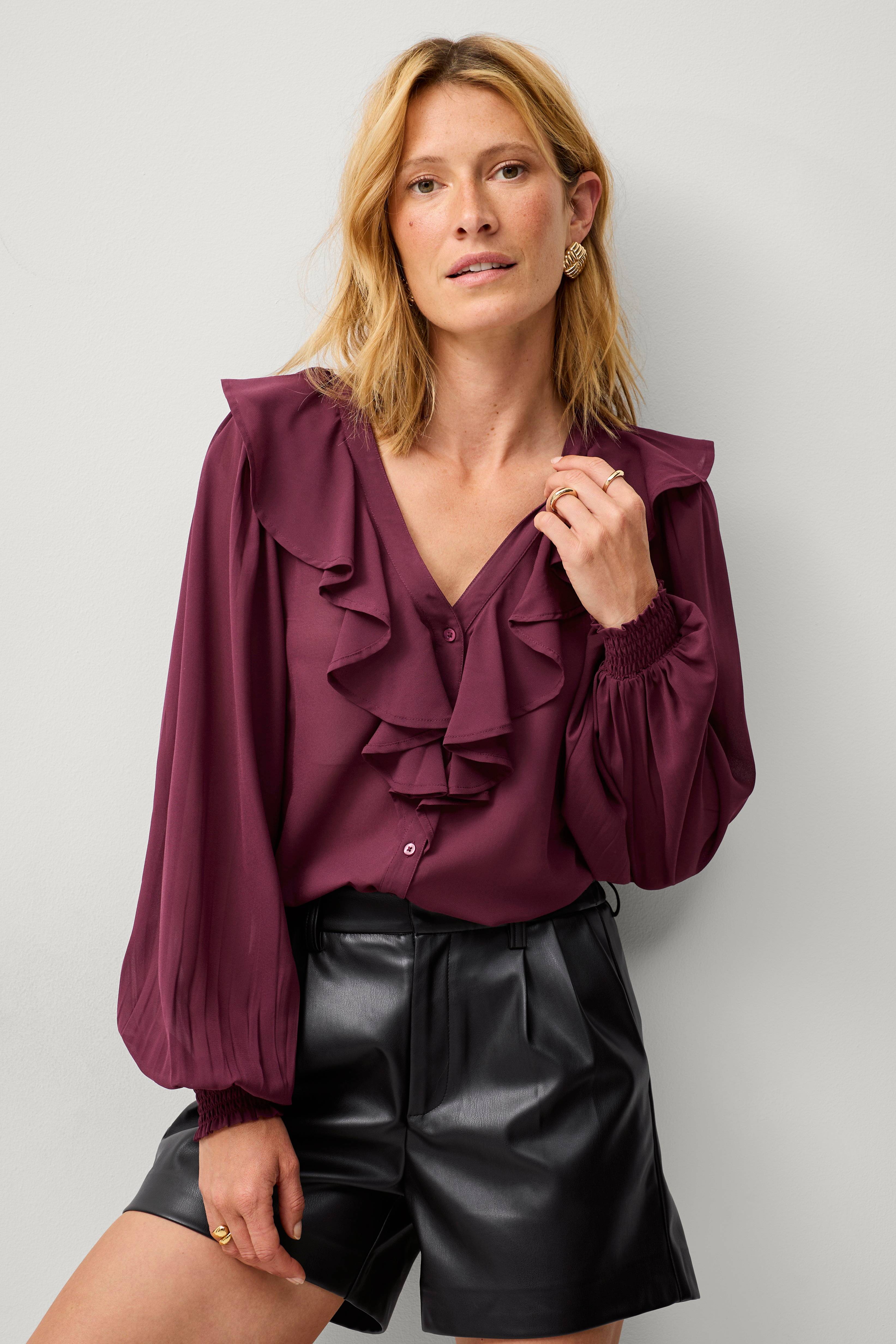 • Bluse i chiffon • V-formet hals • Volang rundt halsen og foran • Brede bobleermer med vaffelsøm i ermeslutten • Lengde: 60 cm i størrelse 34/36 • Produktet inneholder gjenvunnet materiale som er brukt for å redusere mengden avfall, samtidig som det ikke er brukt nye ressurser.