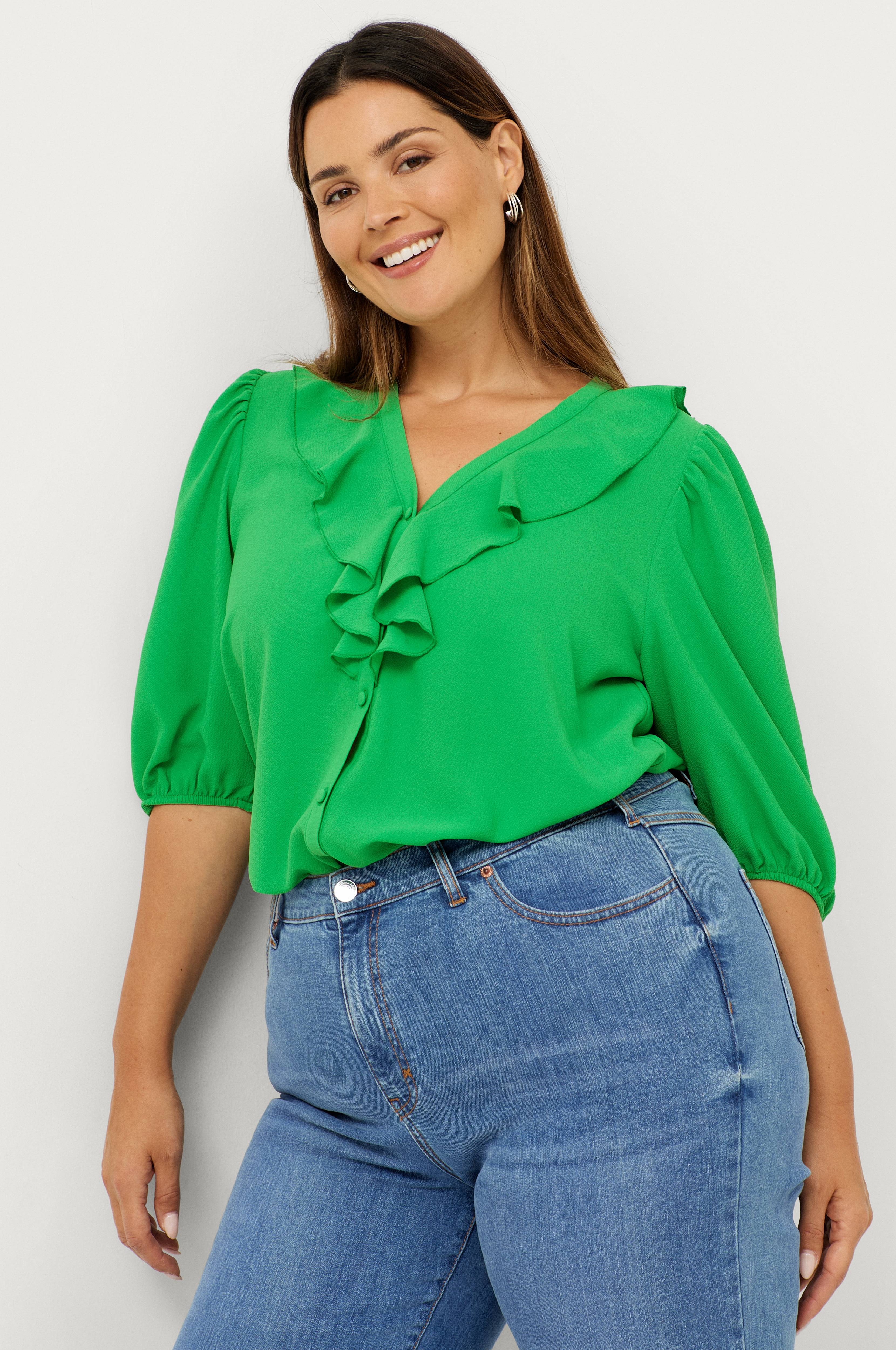 • V-hals snitt med volang• Stoffdekkede knapper foran• Ballongermer 3/4 lang med elastiske mansjetter• Rysje på skuldrene• Kreppet kvalitet• Lengde: 65 cm i størrelse 42/44