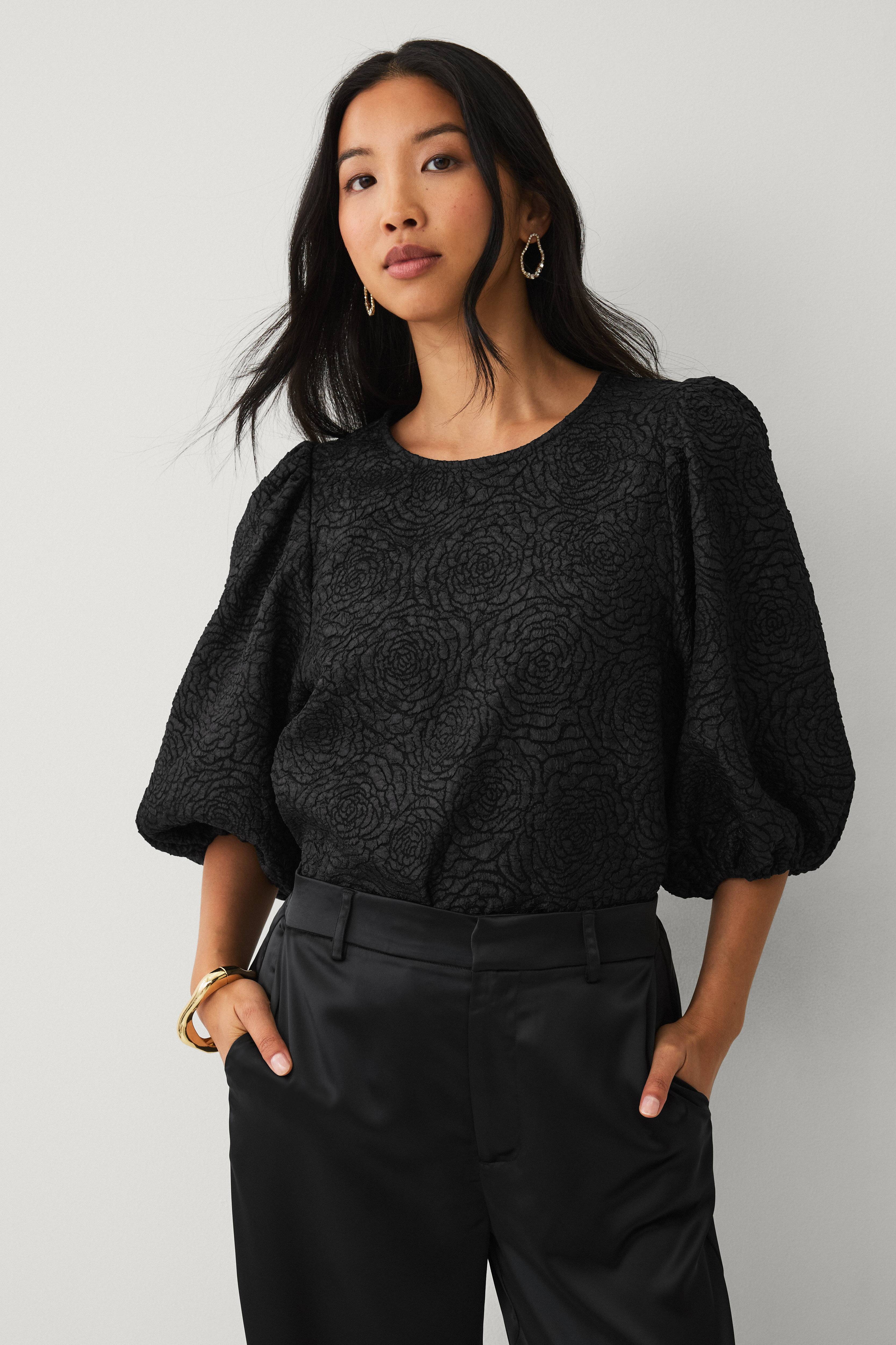 • Jacquardvevd bluse med rund hals• Nøkkelhulsåpning med knytbar tråd i nakken• Halvlange ballongermer med gummistrikk i ermeslutten• Lengde: 57 cm i størrelse S