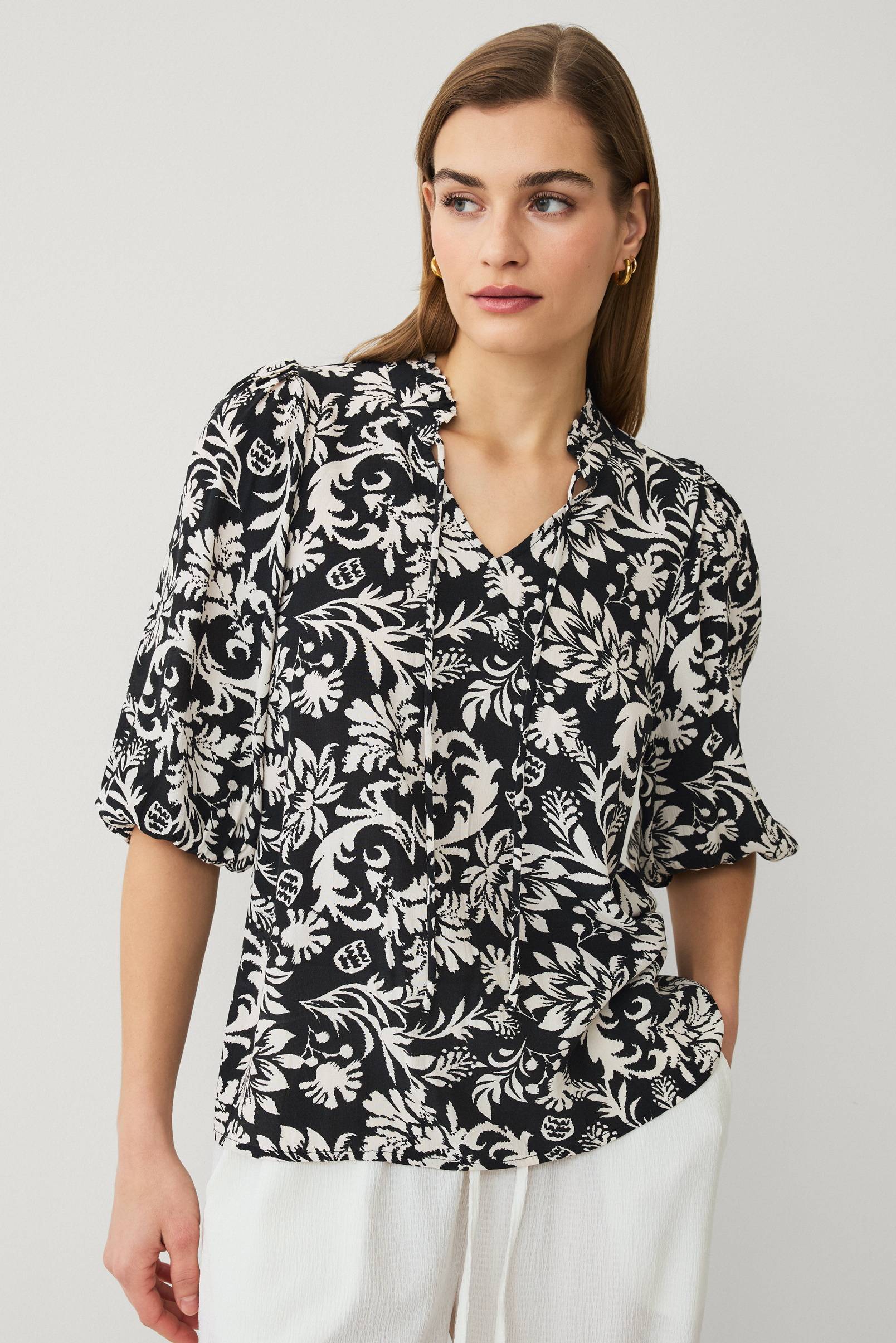 • Bluse i viskose• Høy krage med dekorativ volangkant• Skjær med knytbar tråd foran• Halvlange bobleermer• Normal passform• Lengde: 62 cm i størrelse S