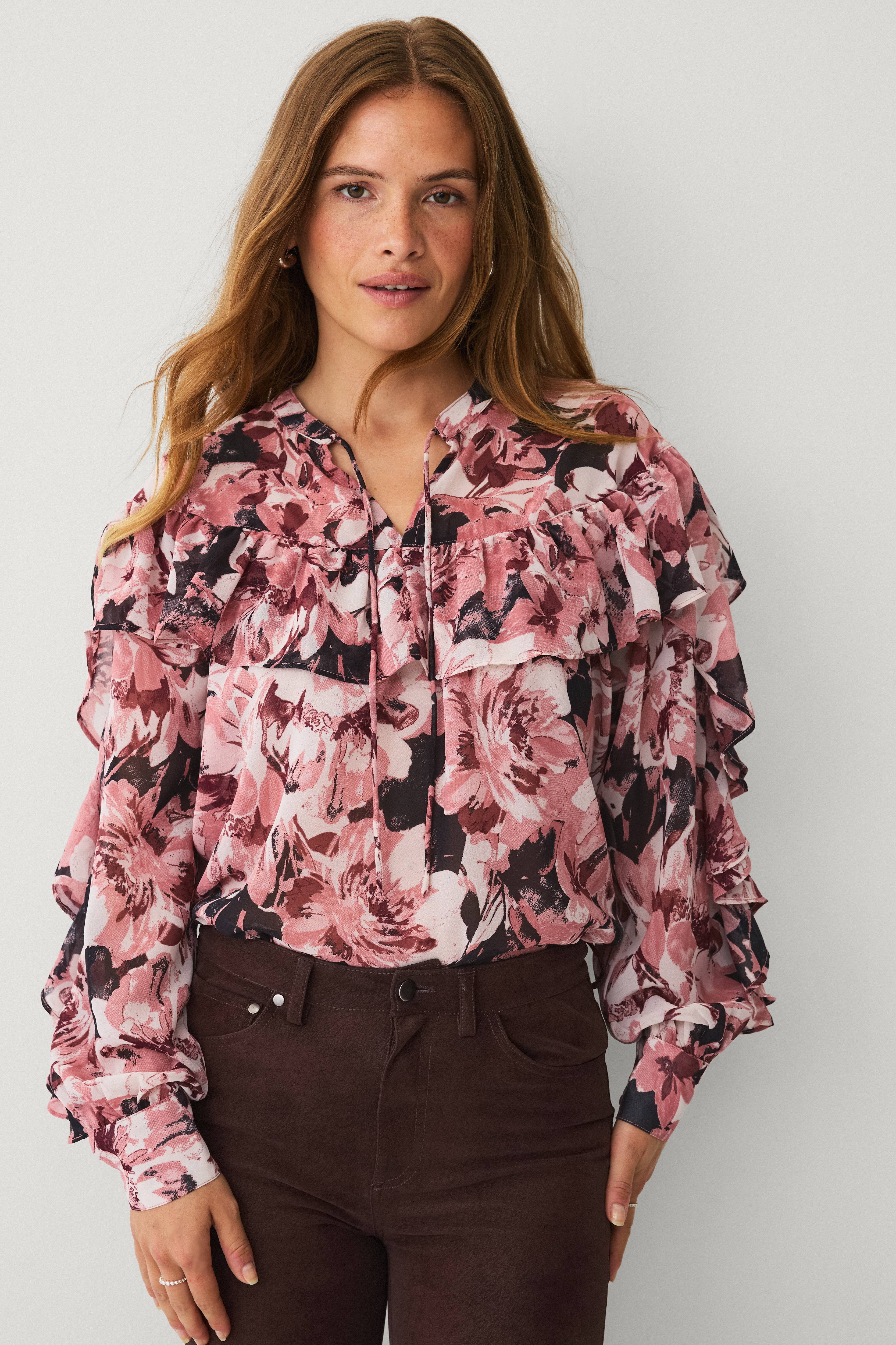 • Semitransparent chiffonbluse med løs passform• Rund hals med skjær og knutedetalj• Lange ermer med mansjetter og knapper i ermeslutten• Volang på toppen og langs med ermene• Lengde: 58 cm i størrelse S