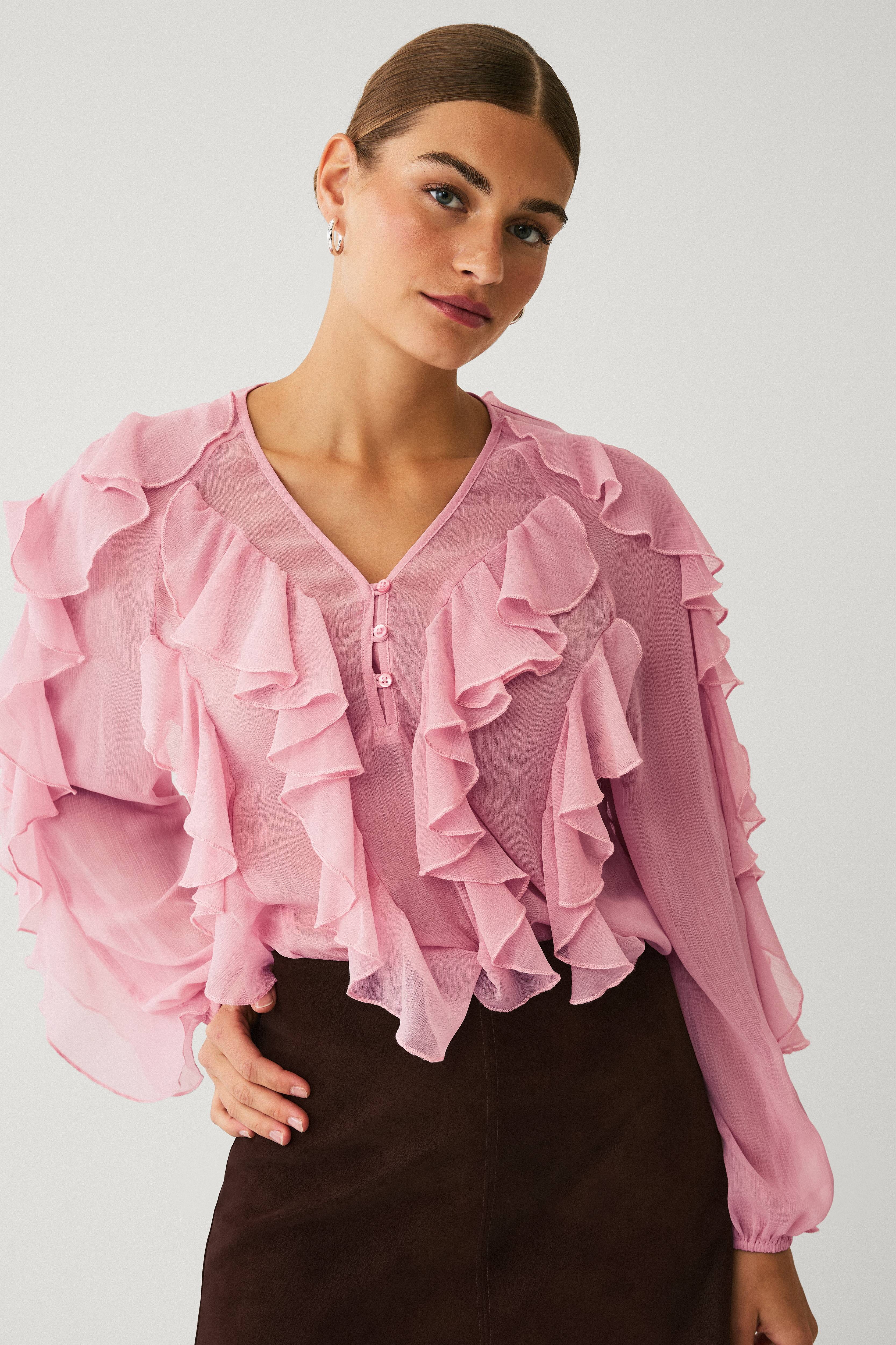 • Gjennomsiktig bluse i chiffon med volanger rundt• V-formet hals med tre knapper foran• Lange ermer med gummistrikk i ermeslutten• Lengde: 63 cm i størrelse S