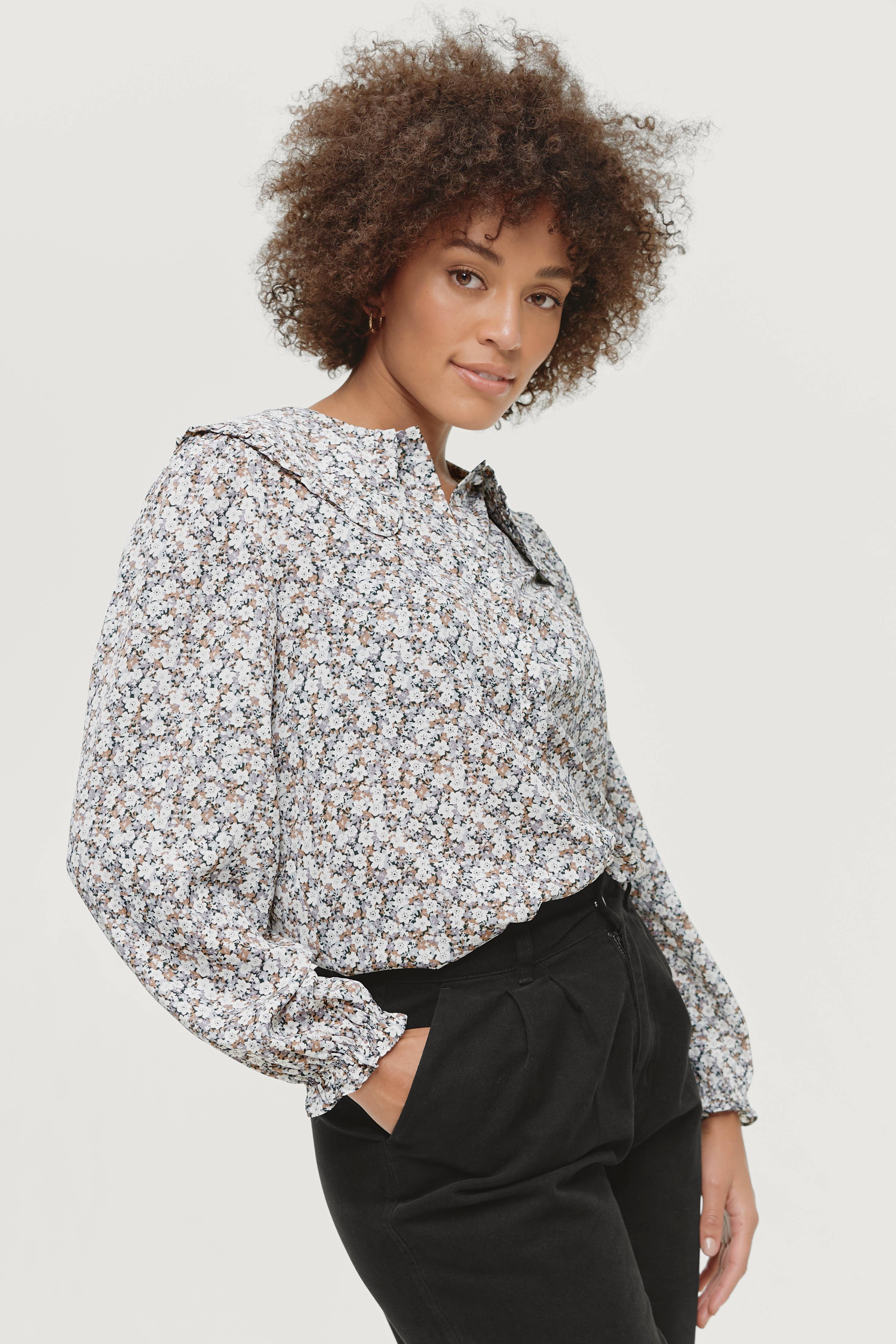 Bluse Olivia med kledde knapper foran, bred volangkrage og noe vide ermer med rynket skuldersøm og elastiske ermekanter med liten volang. Framstilt i vevd, mønstret kvalitet. Lengde ca. 62 cm i str 36.