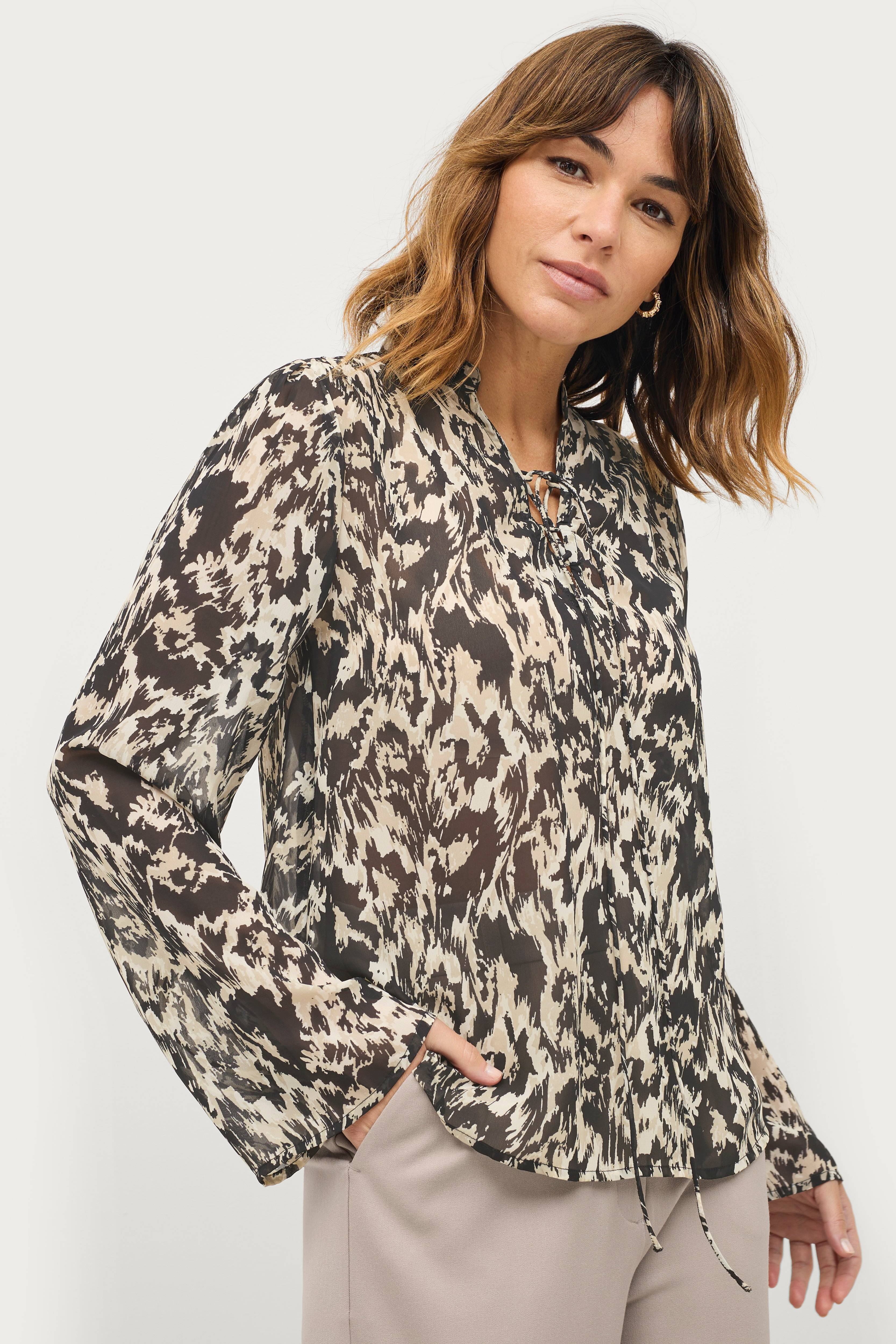 • Gjennomsiktig bluse i chiffon • V-hals snitt med snøring • Rysje på skuldrene • Lengde: 60 cm i størrelse 34/36 • Produktet er GRS-sertifisert. Dette betyr at det inneholder sporbart, gjenvunnet materiale, og oppfyller GRS’ miljømessige og sosiale krav til ansvarlig produksjon gjennom hele fremstillingsprosessen. Samtidig får gamle ressurser nytt liv istedenfor å bruke nye.