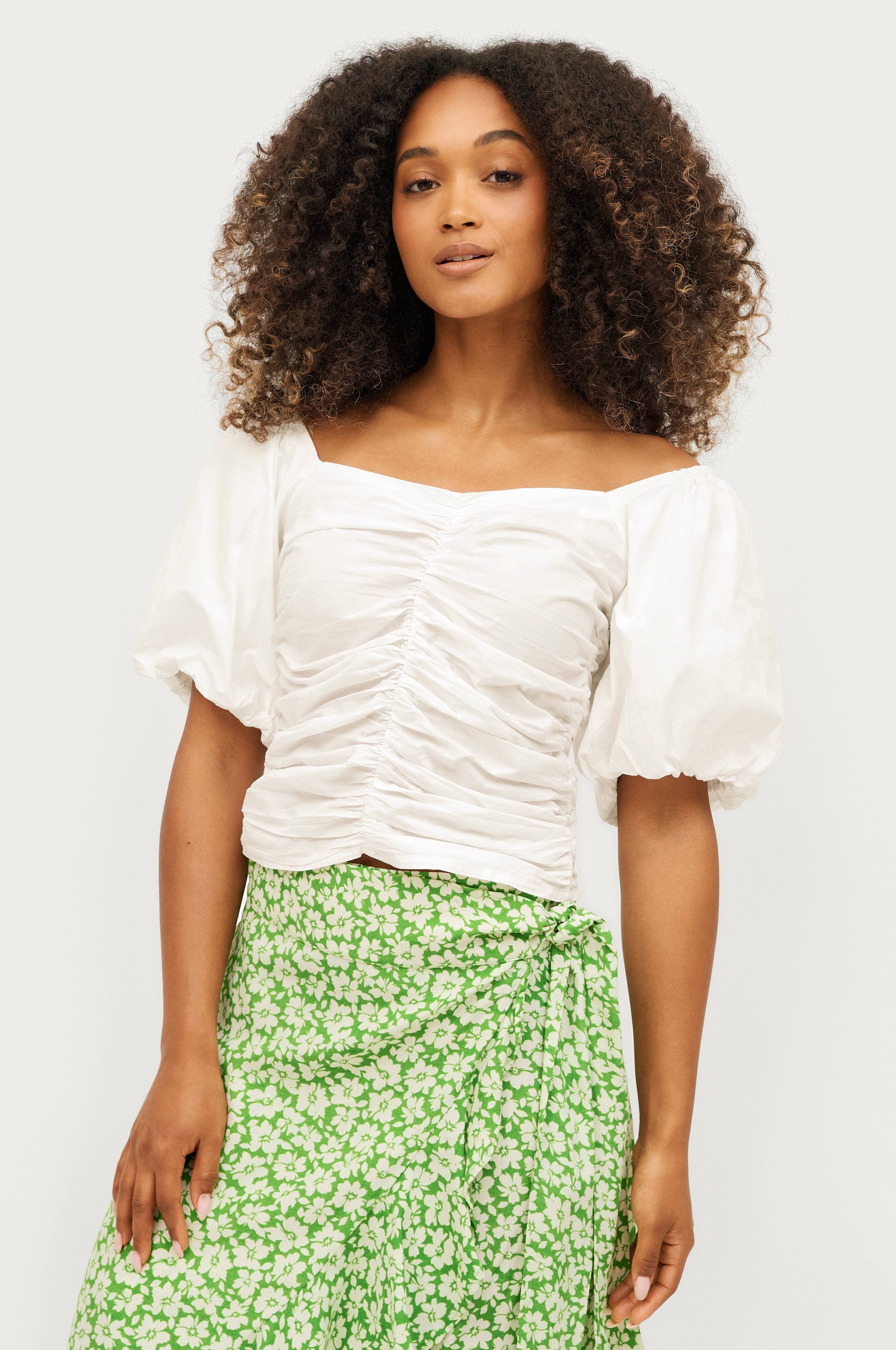 • Bluse i bomull • Bred, firkantet hals • Brede, korte bobleermer med elastisk strikk i ermeslutten • Vaffelsøm foran med samlede detaljer • Samlet, langsgående søm bakpå • Lengde: 44 cm i størrelse 34/36