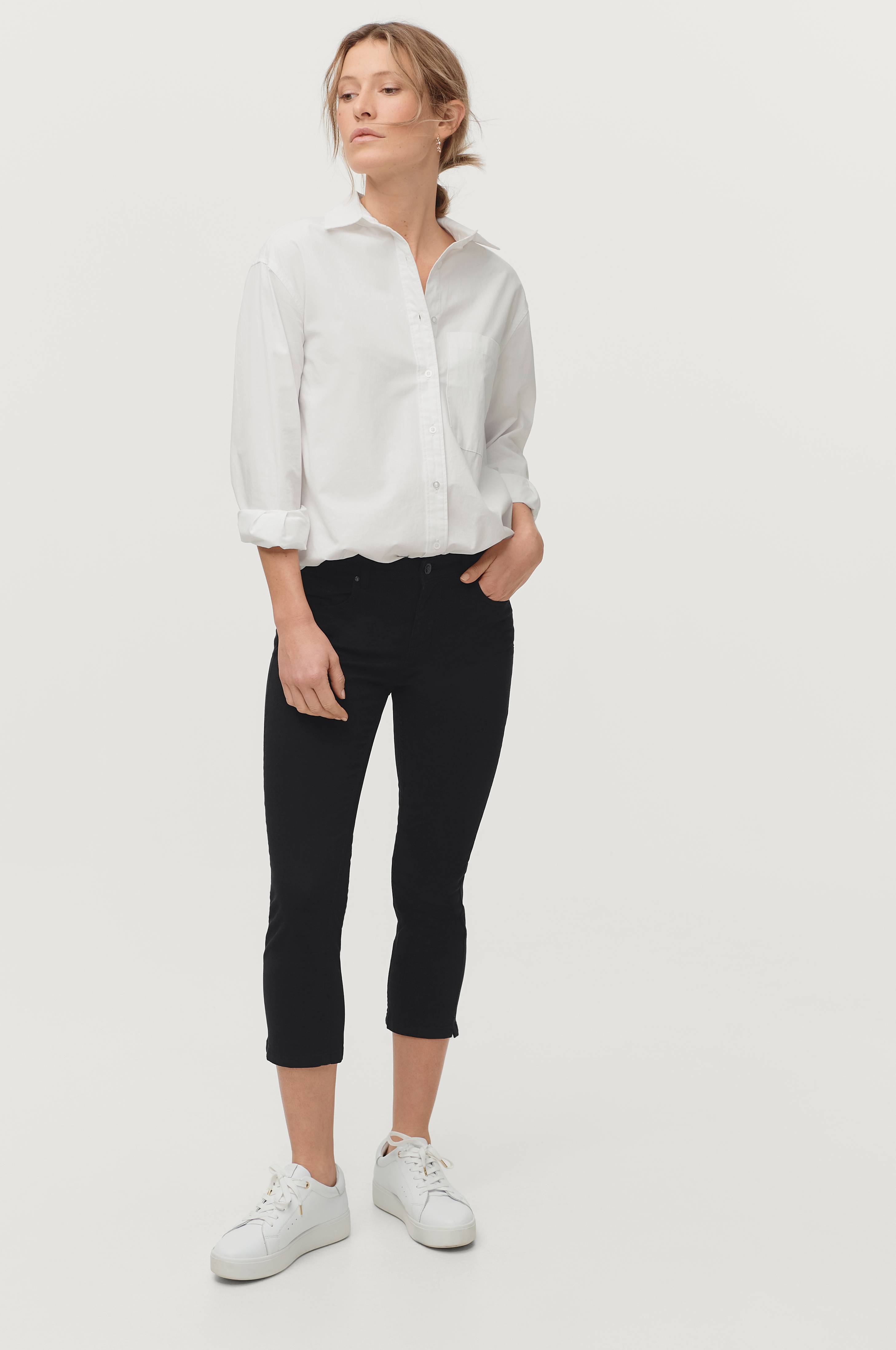 Capribukse i vevd, myk stretchtwill med normalhøy midje, smal passform og smale ben. Femlommersmodell med nagledekor på lommene foran. Linning med hemper og knapp samt gylf med glidelås. Splitt i utsiden av benkantene. Indre benlengde ca. 60 cm og fotvidde ca. 35 cm i str 38.
