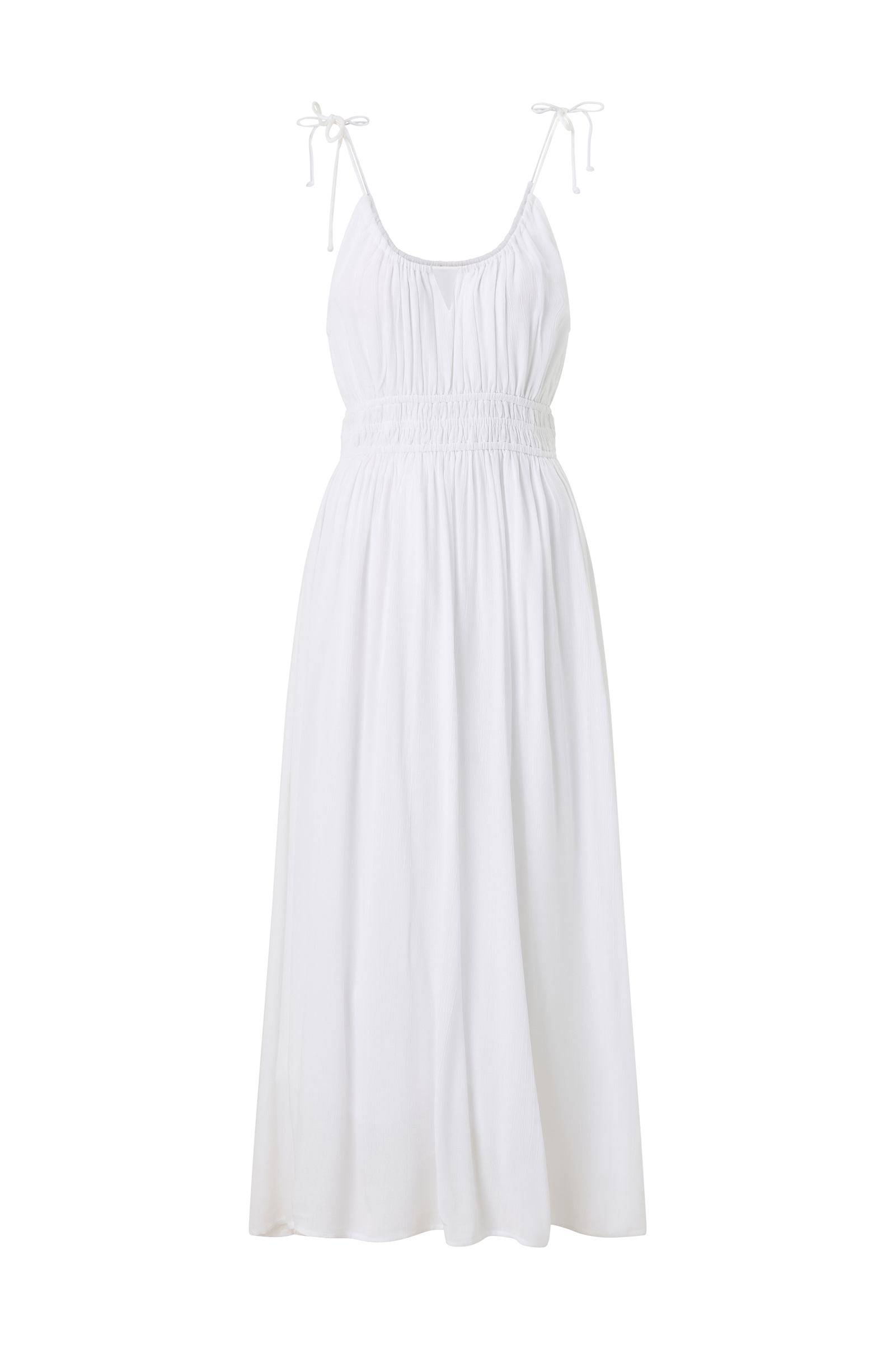 • Lang, fôret strandkjole med elastisk vaffelsøm på toppen