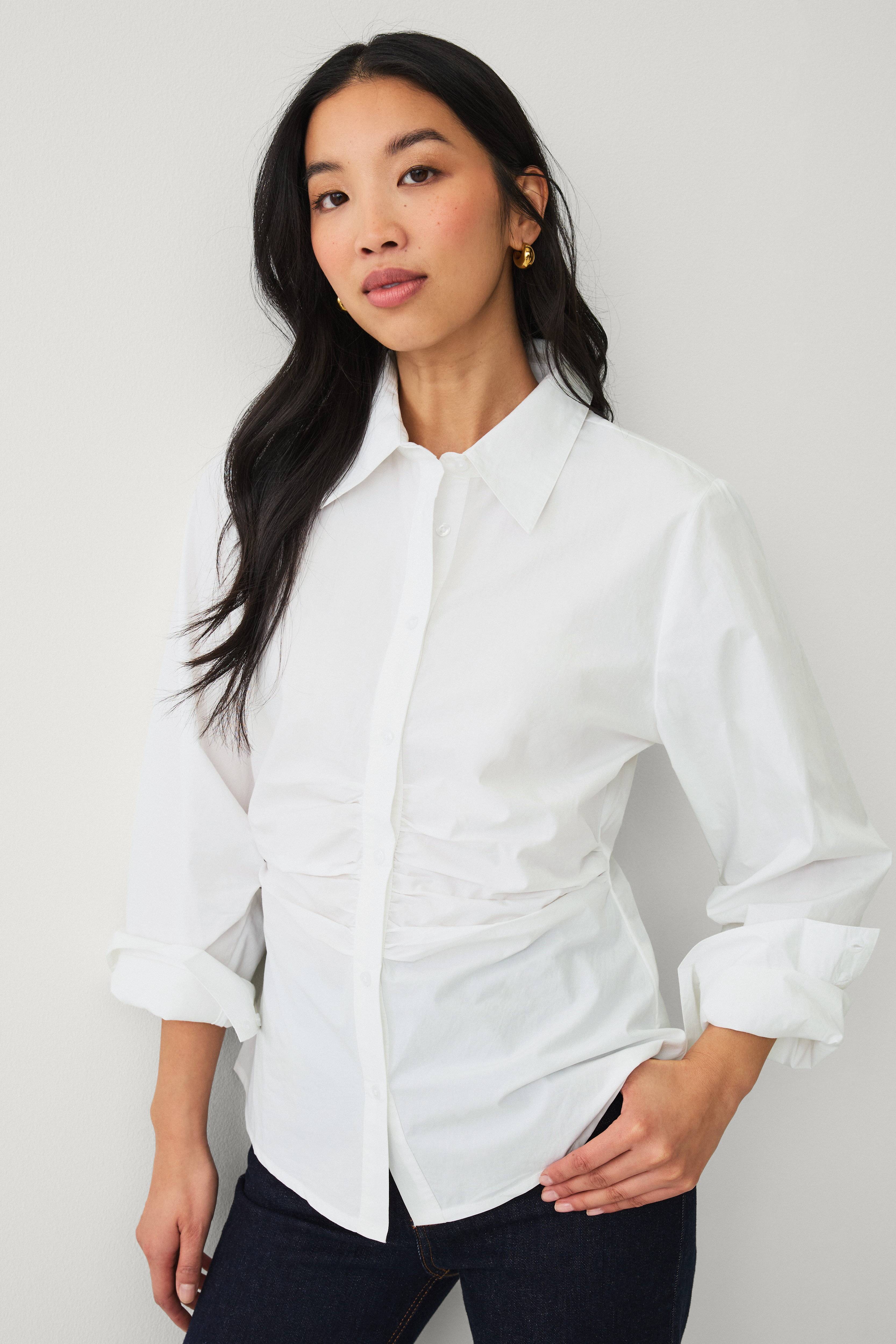 • Skjorte i bomull• Knappstolpe foran• Drapert rynke ved midjen• Lange ermer med krympede detaljer• Avrundet linning• Figurformet passform• Lengde: 66 cm i størrelse S