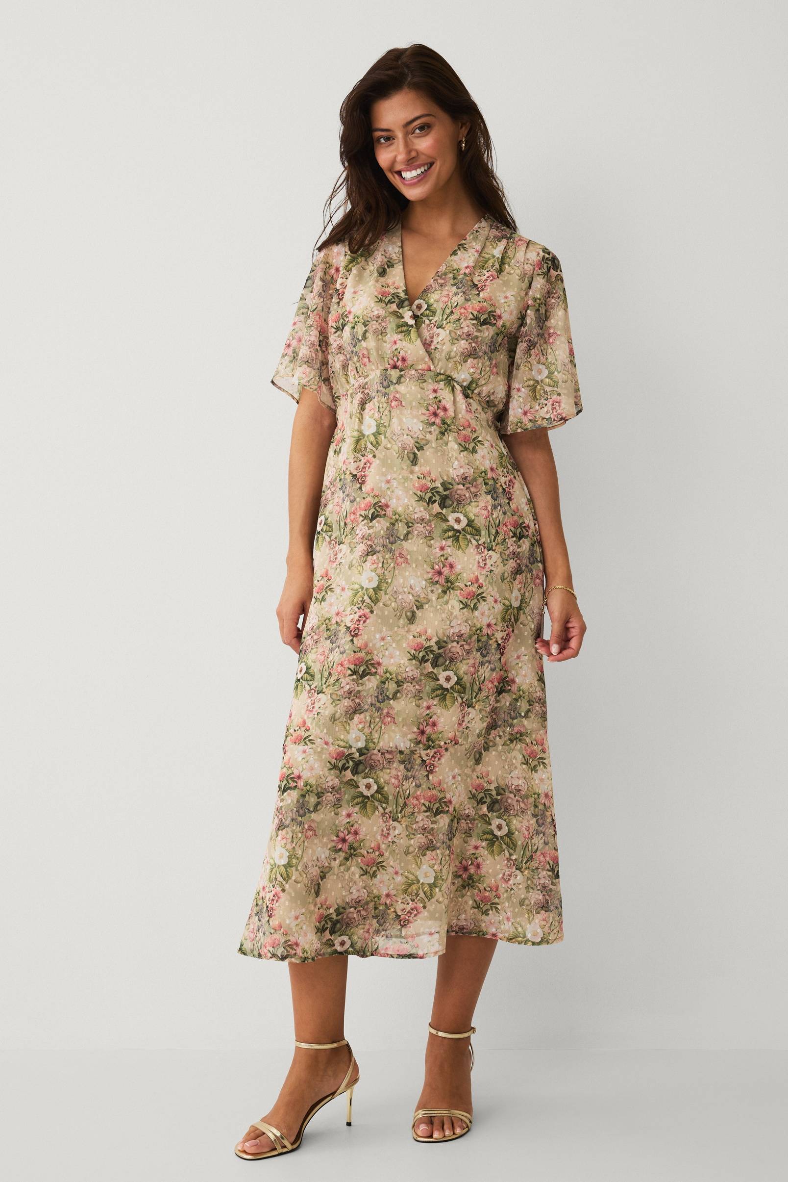 • Fôret kjole i chiffon• Innpakket detalj på toppen• Korte, utsvingte ermer• Gummistrikk i midjen bak• Normal passform• Lengde: 127 cm i størrelse 36