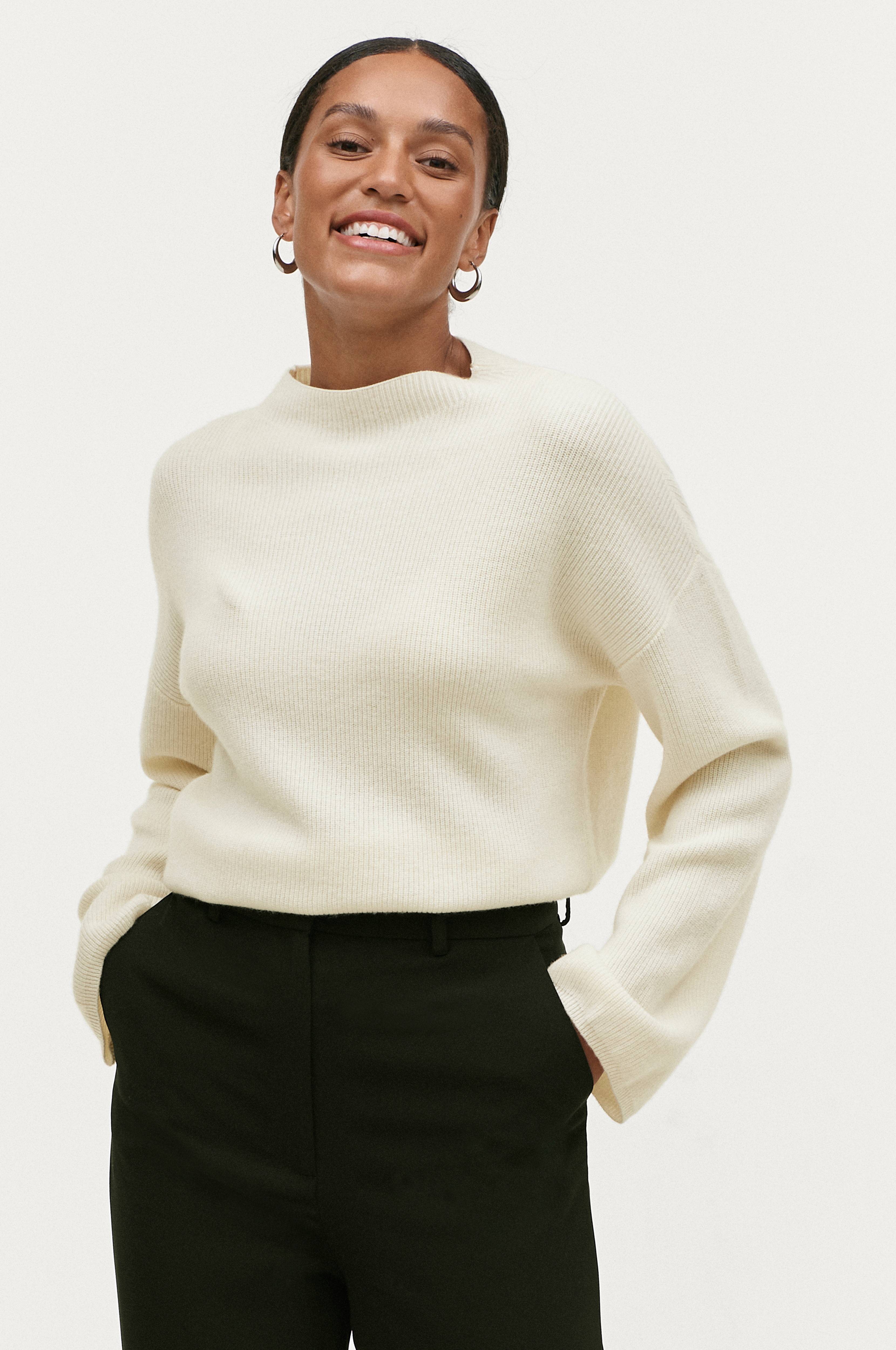 Genser Flora er ribbestrikket i en myk blanding av kasjmir og ull. Høy, rund hals, lave skuldersømmer og vide ermer. Lengde ca. 61 cm i str 34/36.