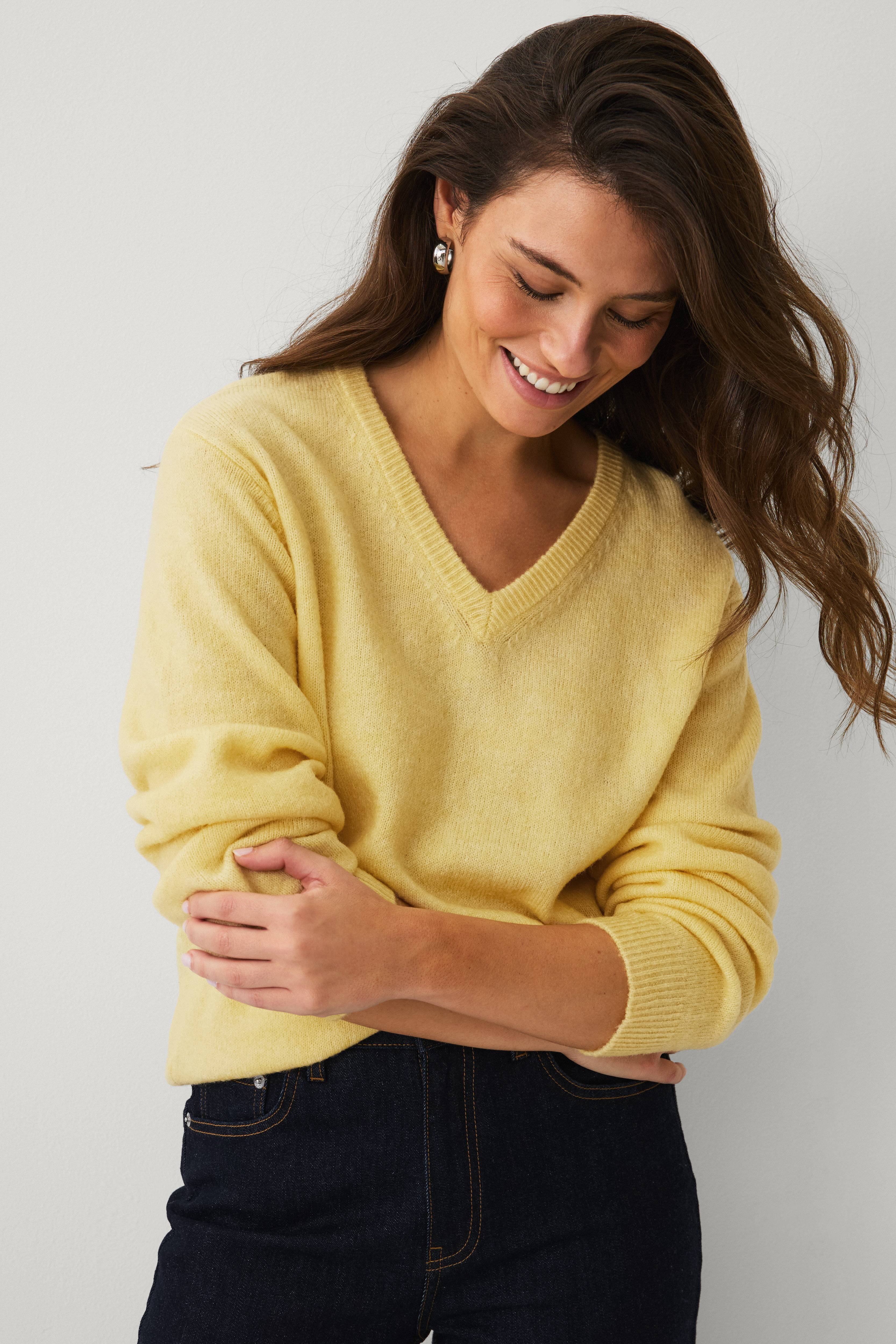 • Myk, strikket genser• V-formet hals• Utringede skuldre• Ribbestrikk i ermeslutten og på bunnen• Lengde: 62 cm i størrelse S