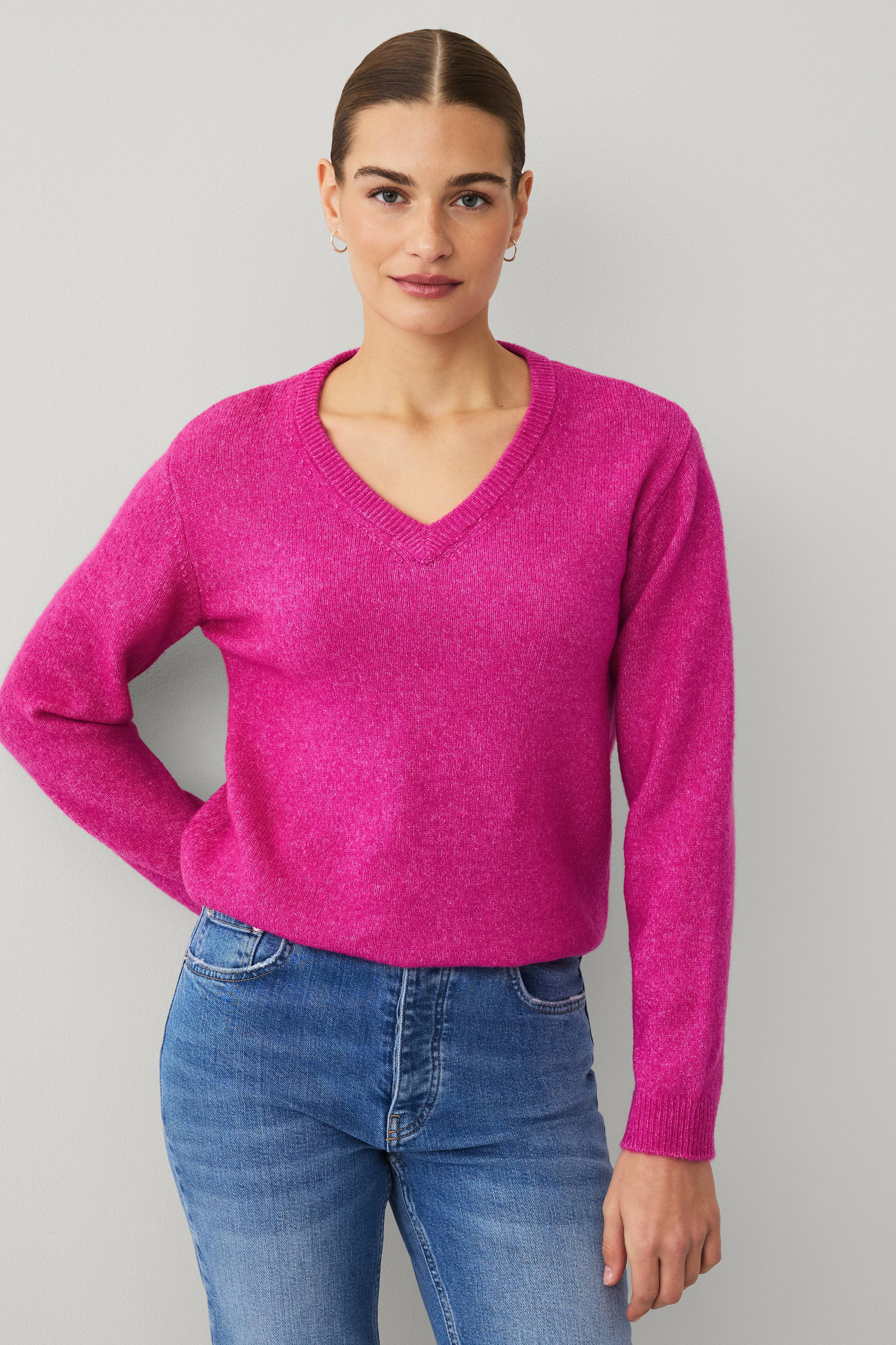 • Myk, strikket genser• V-formet hals• Utringede skuldre• Ribbestrikk i ermeslutten og på bunnen• Lengde: 62 cm i størrelse S