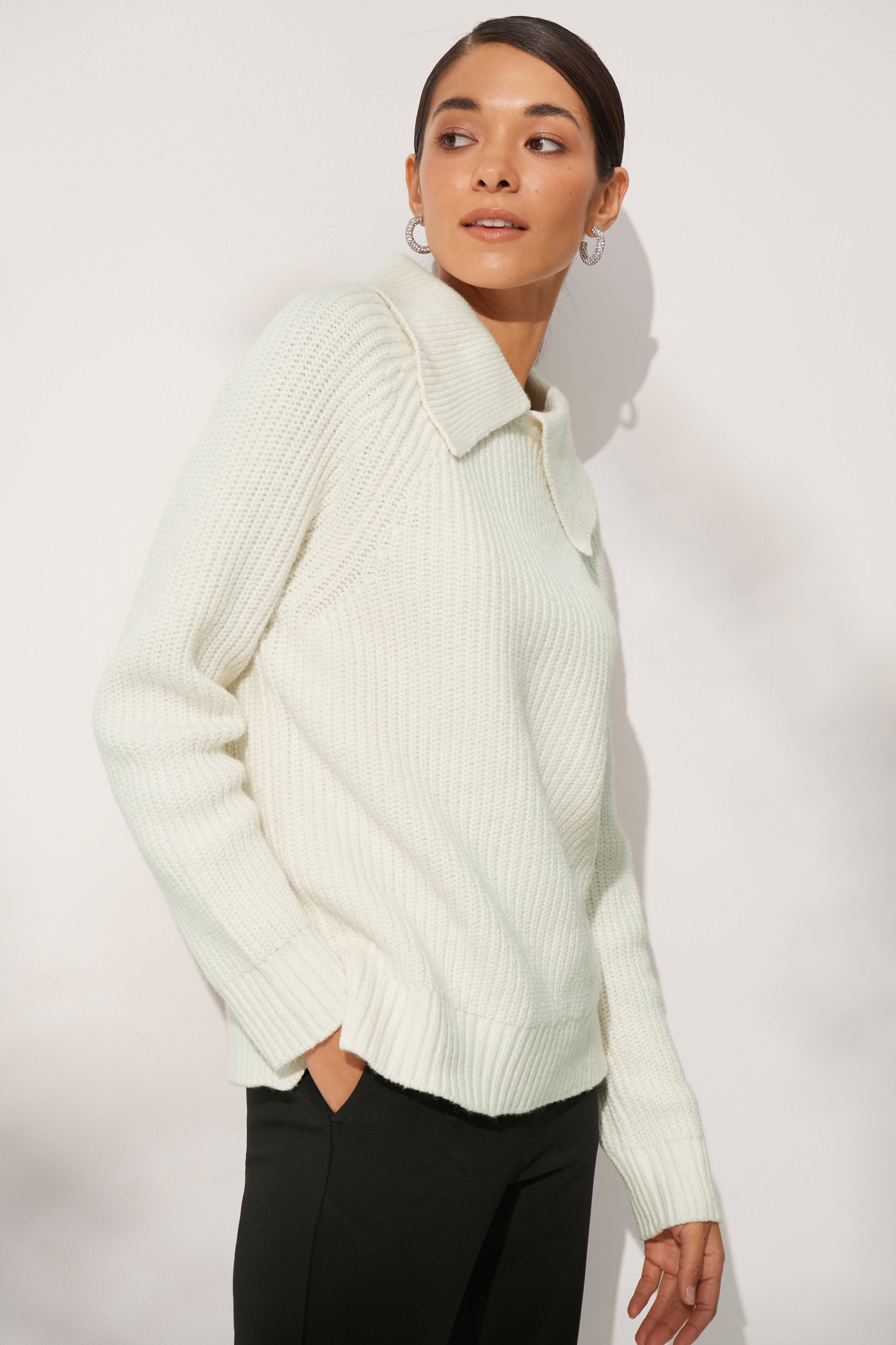 • Grovstrikket genser i bomullsblanding• Stor, strikket krage• Raglanermer• Lengde: 66 cm i størrelse 34/36