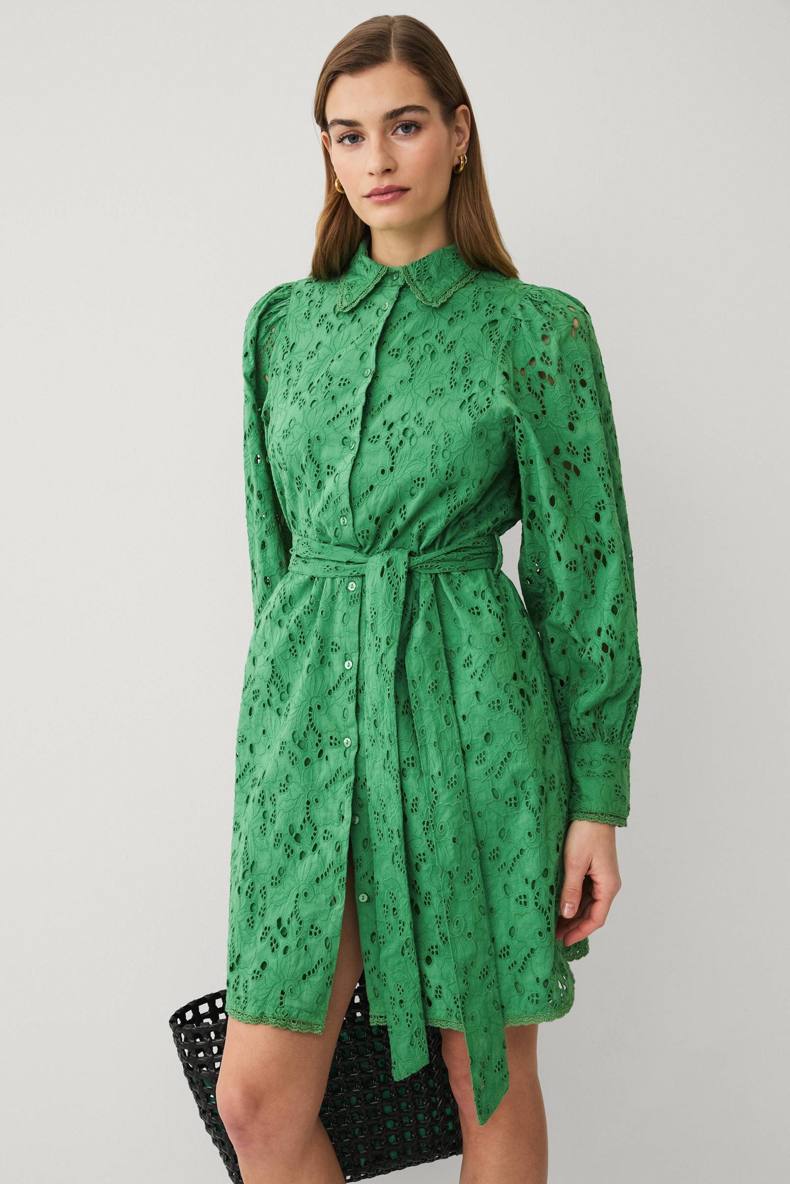 • Hullbrodert kjole med knytbelte• Krage• Lange ballongermer• Mansjetter i ermeslutten• Knappelukking• Tekstilfôr• Lengde: 96 cm i størrelse S