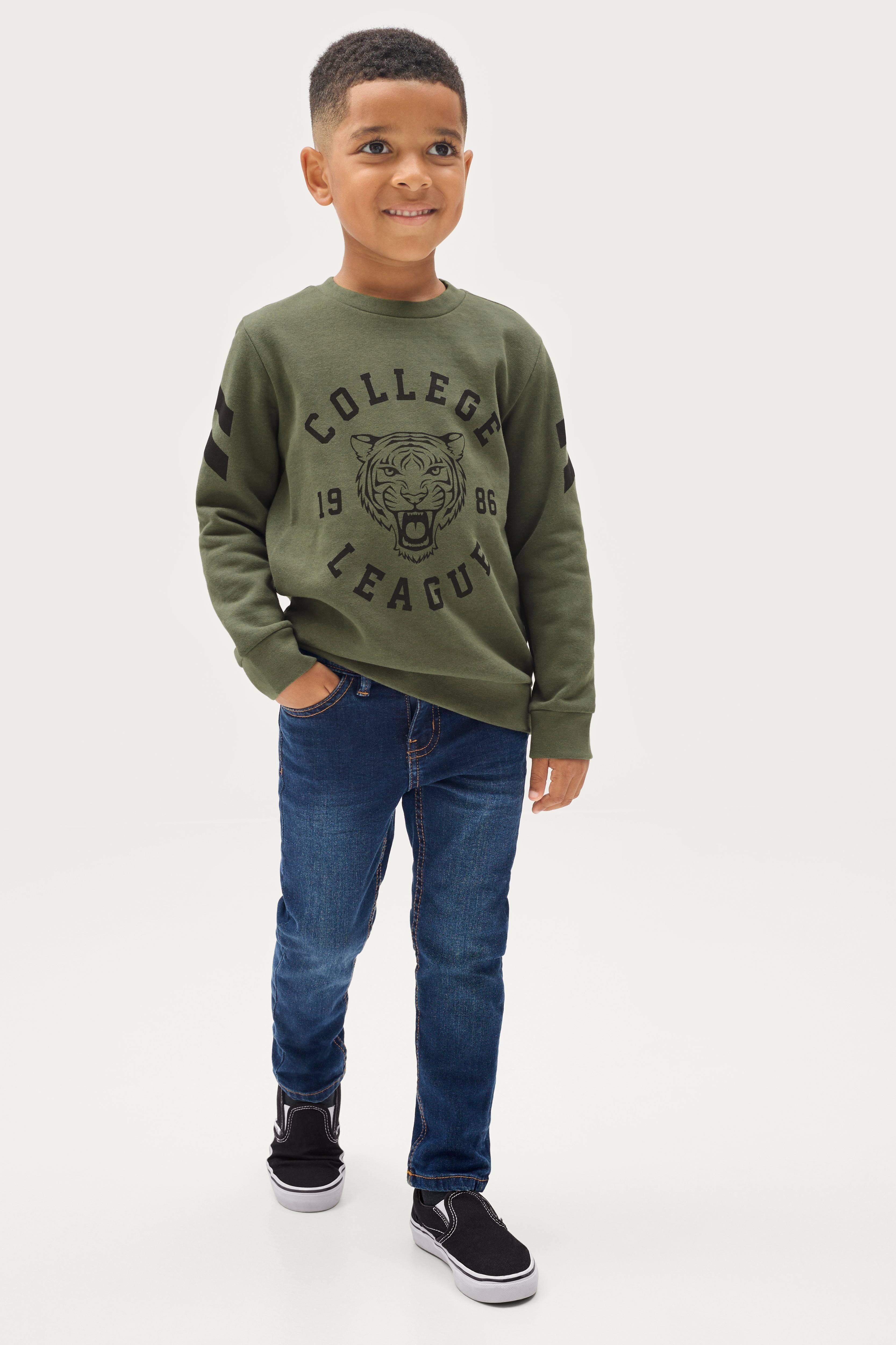 Jeans i stretchdenim med vaskeeffekter. Femlommersmodell med smal passform. C-størrelser. Linning med stropper, knapp og glidelåsgylf. Regulerbar midjevidde med innvendig knappestrikk.