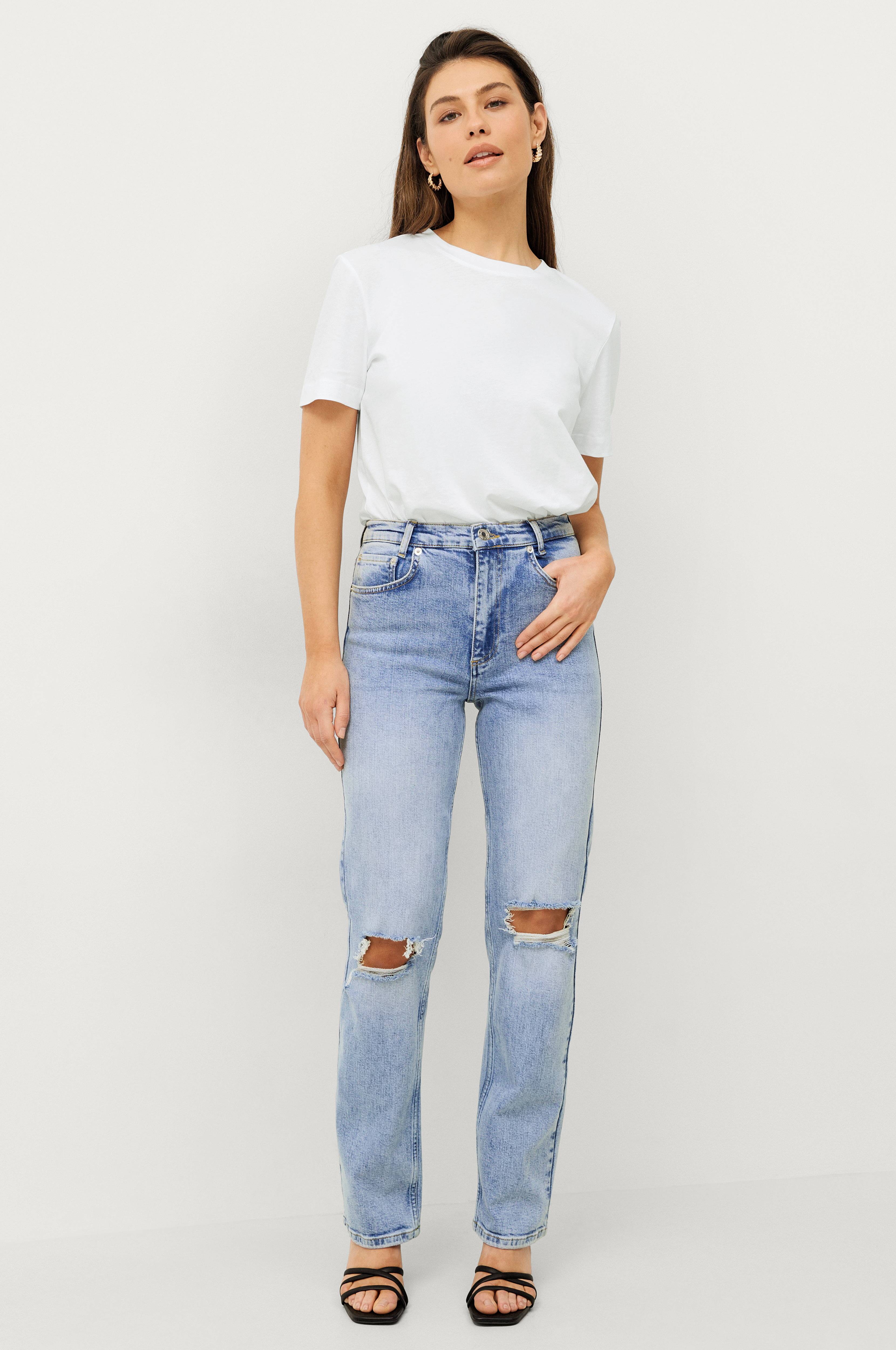 Jeans i stretchdenim med høy midje og rette ben. Femlommersmodell med glidelåsgylf og slitte effekter.