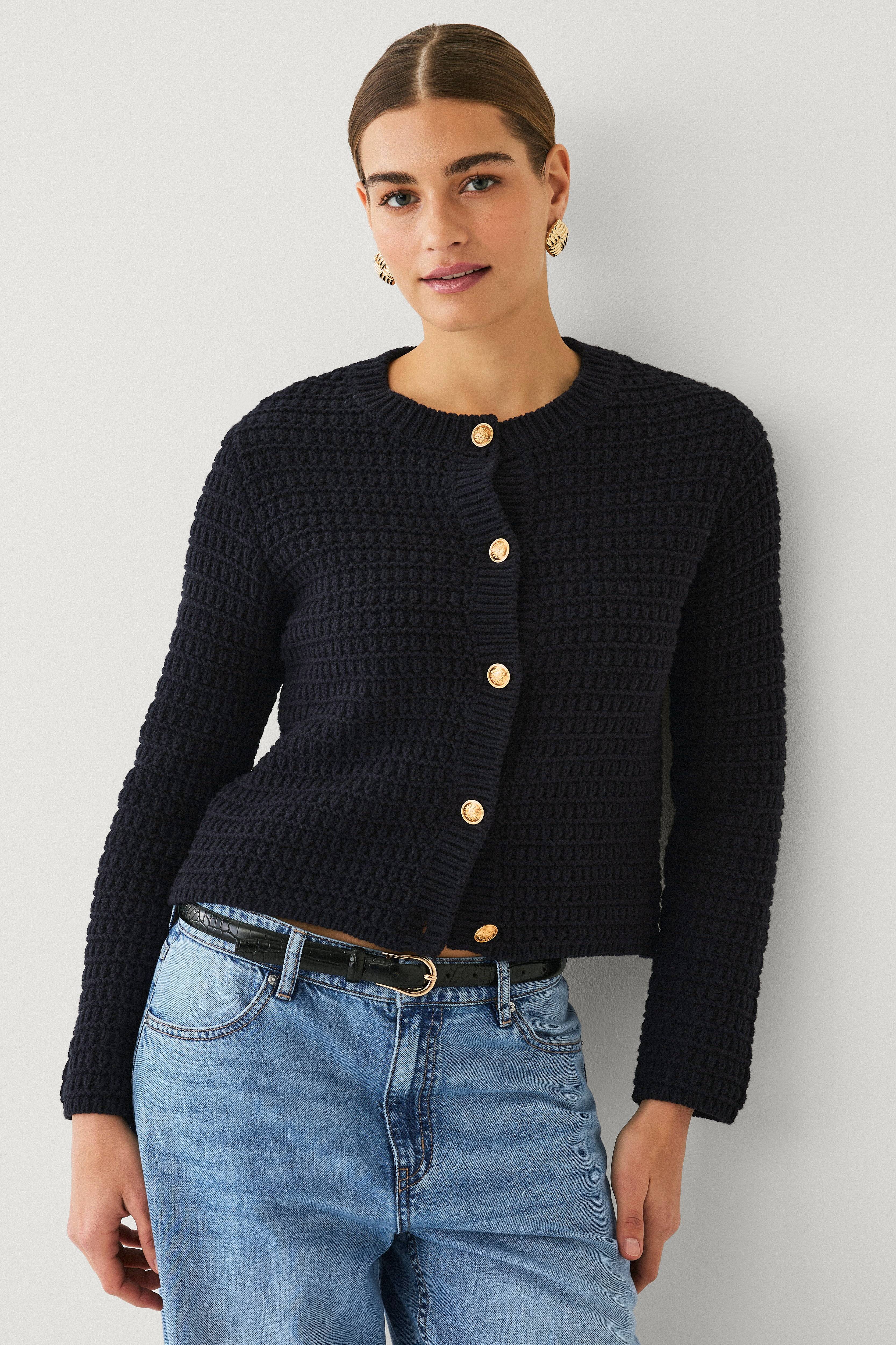 • Strukturstrikket kardigan med lange armer• Ribbestrikk på bunnen og i ermeslutten• Lukning foran med gullfargede, dekorative knapper• Avrundet, ribbestrikket hals• Lengde: 53 cm i størrelse S