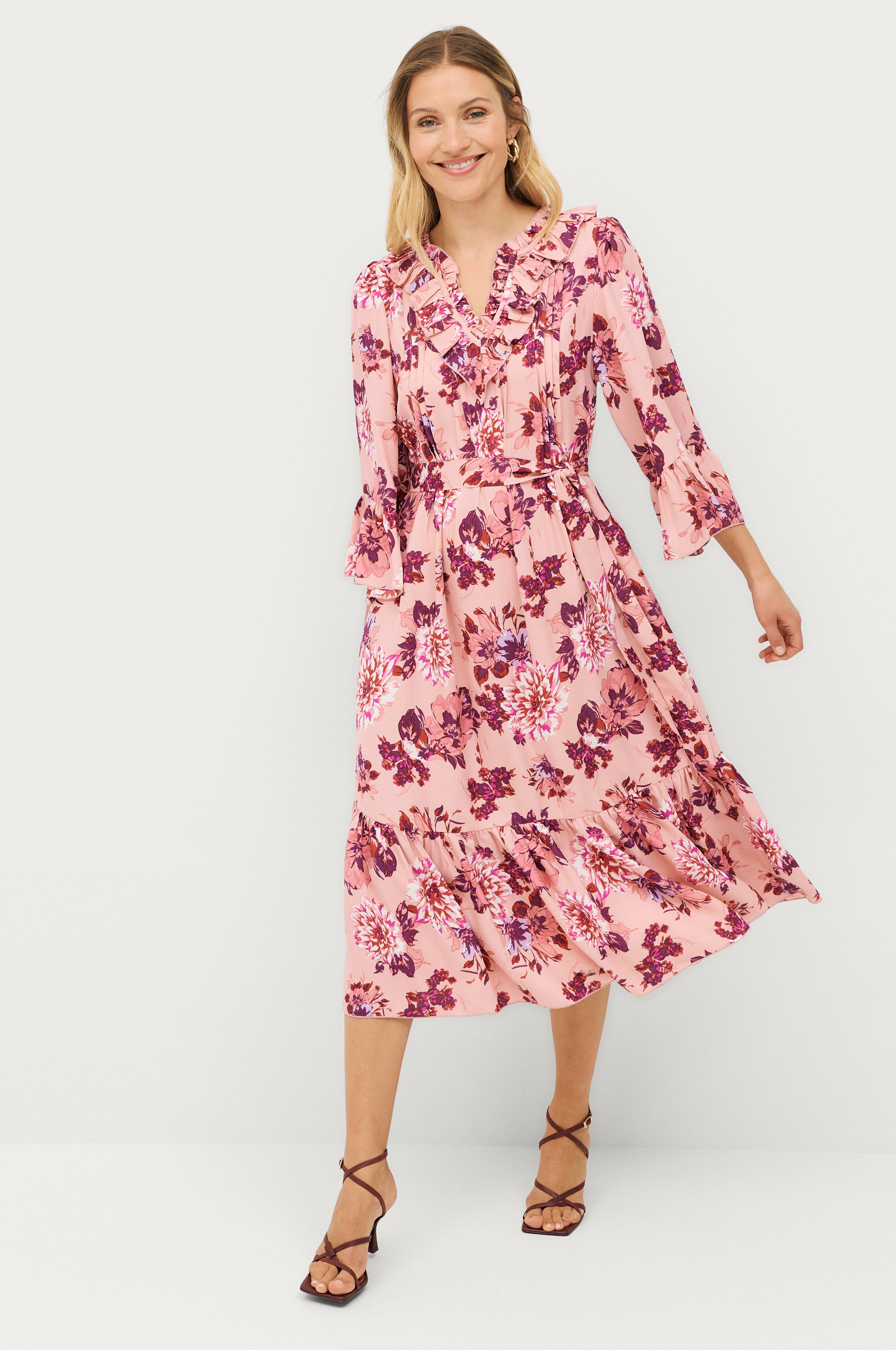 • Volangkjole • V-hals snitt med volang • Armer 3/4 lang med volang i ermeslutten • Sydd stråfolder oppover foran • Volang på bunnen • Knytbart belte ved midjen • Lengde: 124 cm i størrelse 34/36 • Produktet inneholder gjenvunnet materiale som er brukt for å redusere mengden avfall, samtidig som det ikke er brukt nye ressurser.