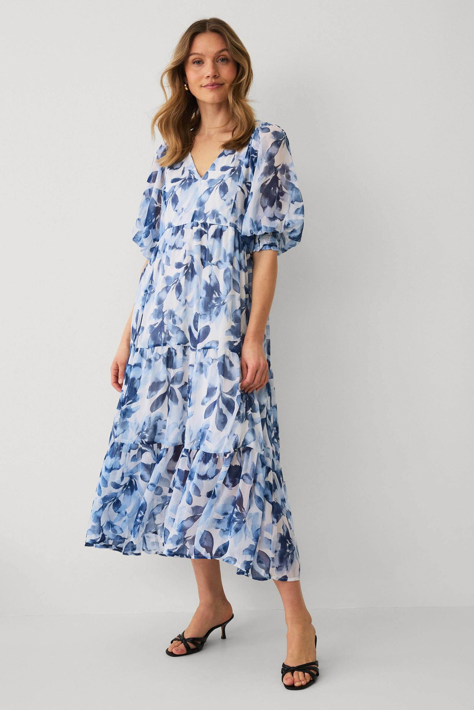 • V-formet hals• Fôret kjole i chiffon• Ufôrete, korte flaggermusermer med vaffelsøm i ermeslutten• Skjørt med utskjæringer• Lengde: 127 cm i størrelse S