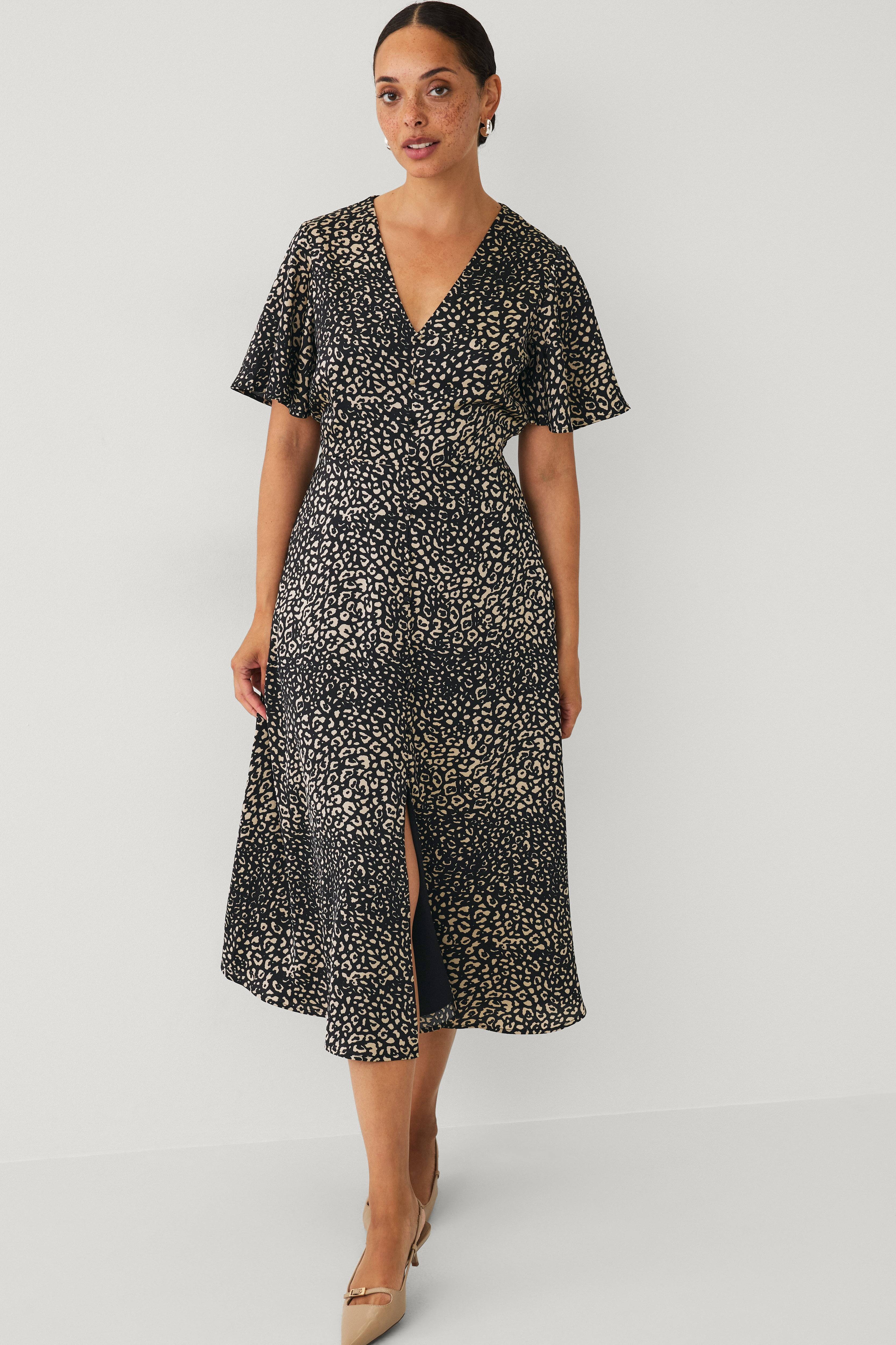 • Leopardmønstret kjole i sateng• V-formet hals• Korte ermer• Dekorative, kledde knapper foran• Utskjæring ved midjen• Glidelås i ene siden• Splitt nedover foran• Lengde: 124 cm i størrelse 36