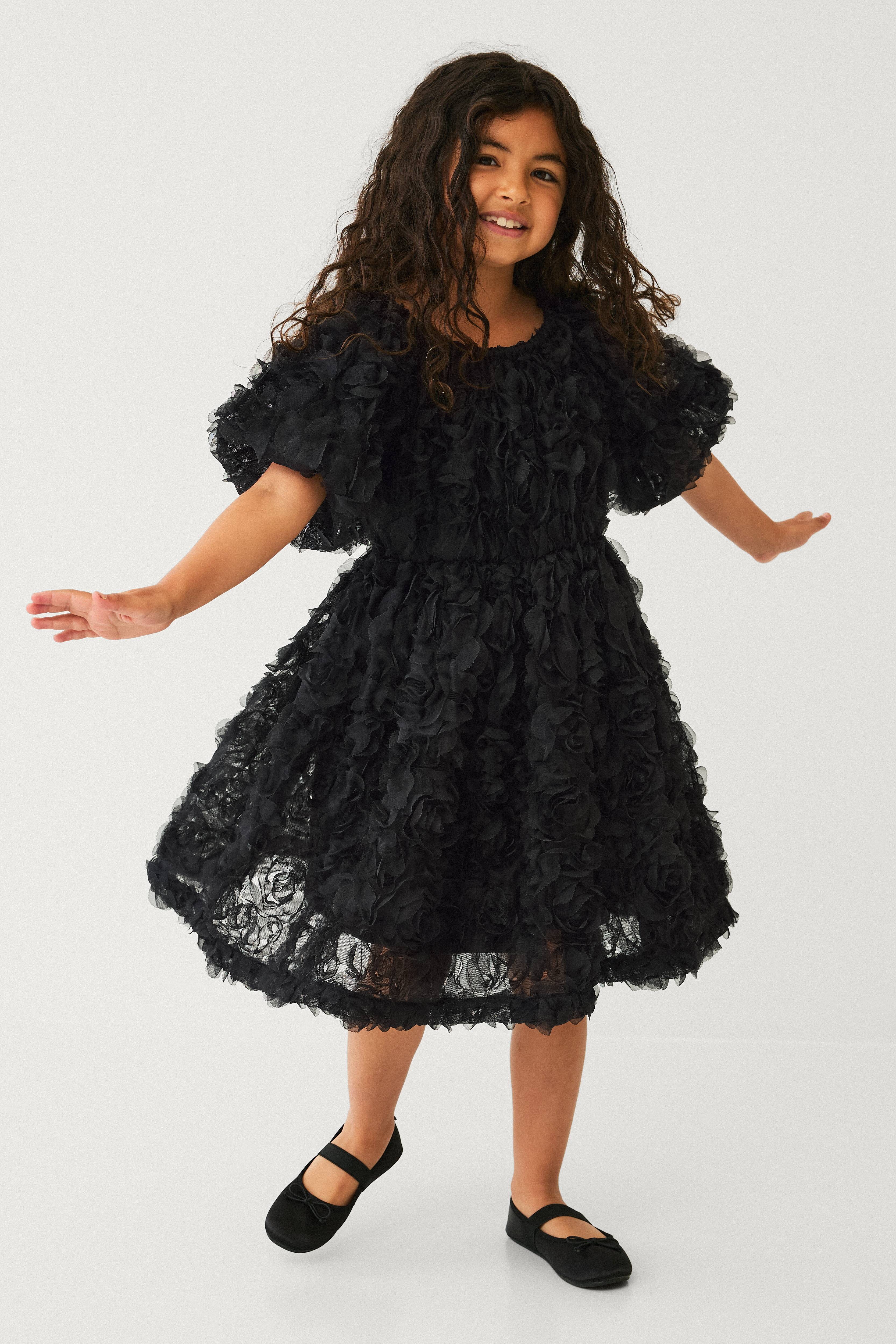 • Fôret kjole i mesh med 3D-blomster • Rund, elastisk hals • Korte ballongermer med gummistrikk i ermeslutten • Gummistrikk ved midjen • Stretchy foring