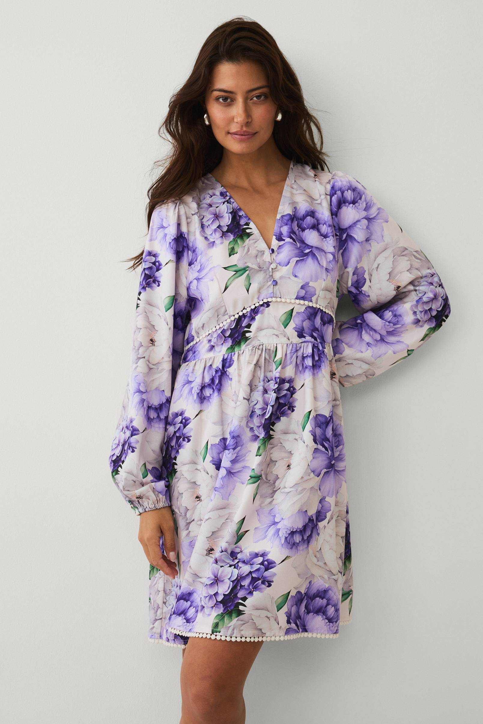 • Kjole med blondebroderier nedenfor bysten og i nedre kant• V-formet hals med tre kledde knapper• Lange puffermer med elastiske ermeender• Samlet utskjæring ved midjen med innvendig gummistrikk bakpå• Lengde: 94 cm i størrelse S