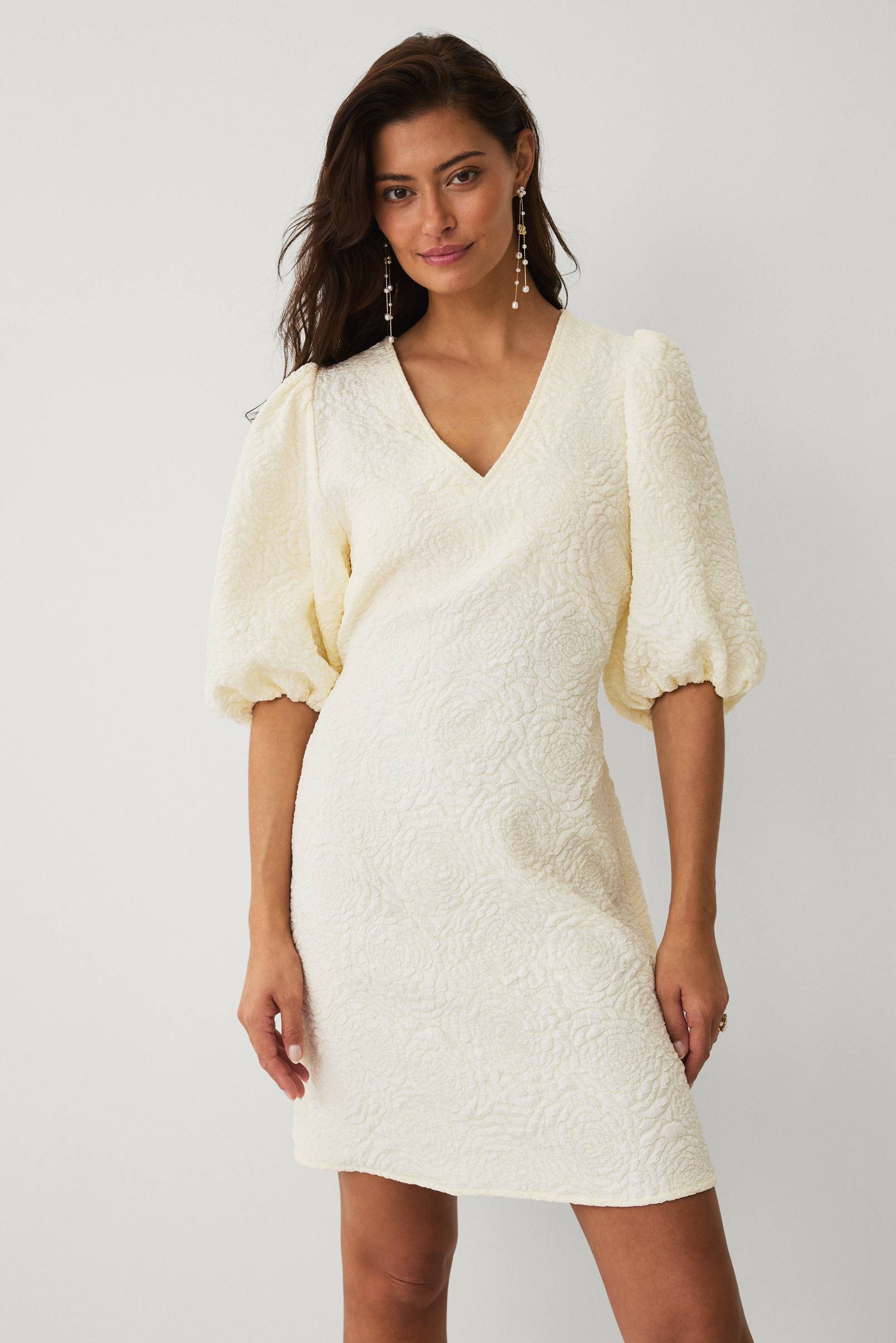 • Kjole med v-formet hals• Blomster mønster i damaskvev• Halvlange ballongermer med gummistrikk i ermeslutten• Gummistrikk i midjen bak• Lengde: 92 cm i størrelse S