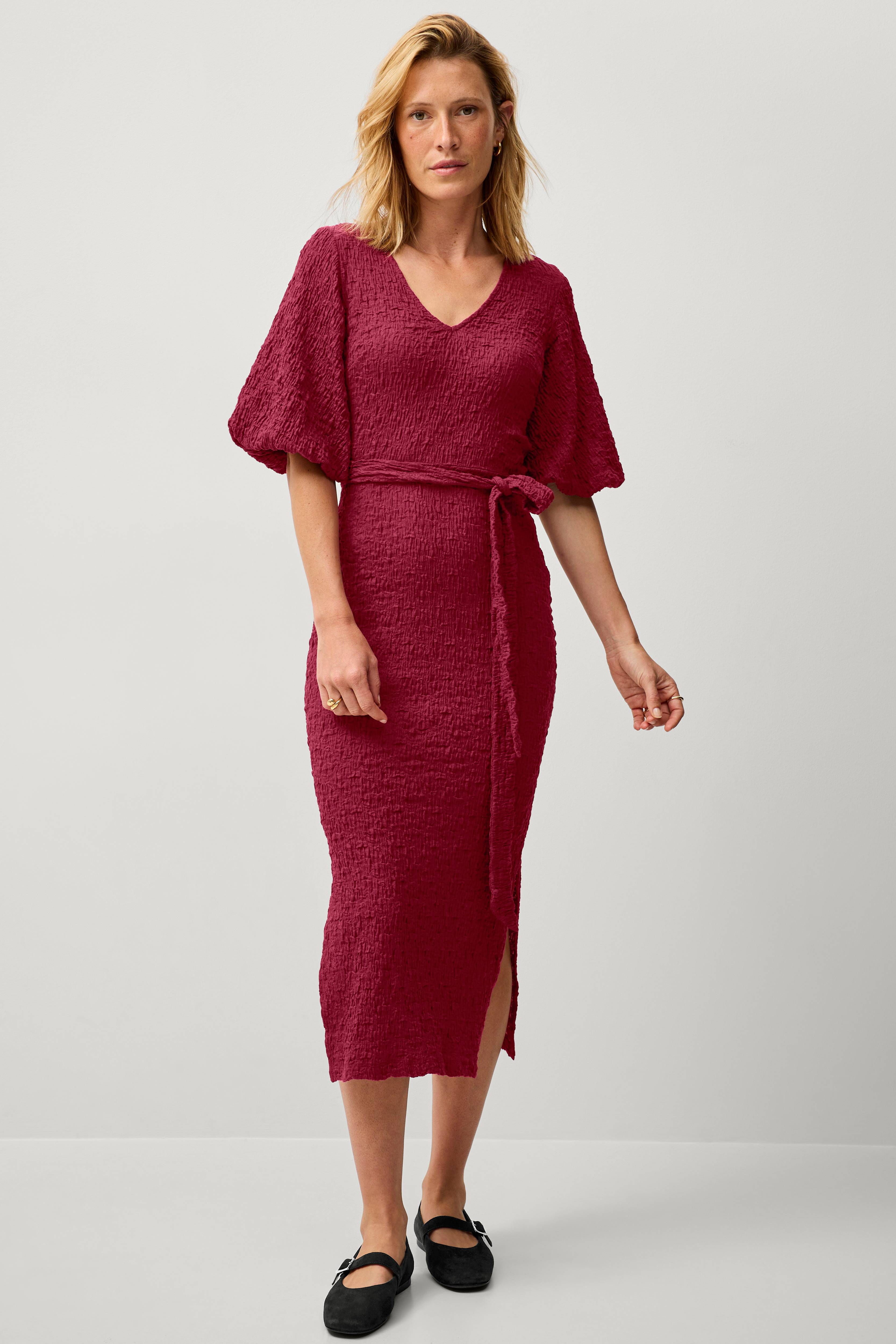Utrolig fin kjole i utrolig fint litt strukturert materiale. Veldig fin på ermet, satt som et skudd. Jeg tok 44/46 og opplever den som normal i størrelsen. Ikke for trang takket være s…