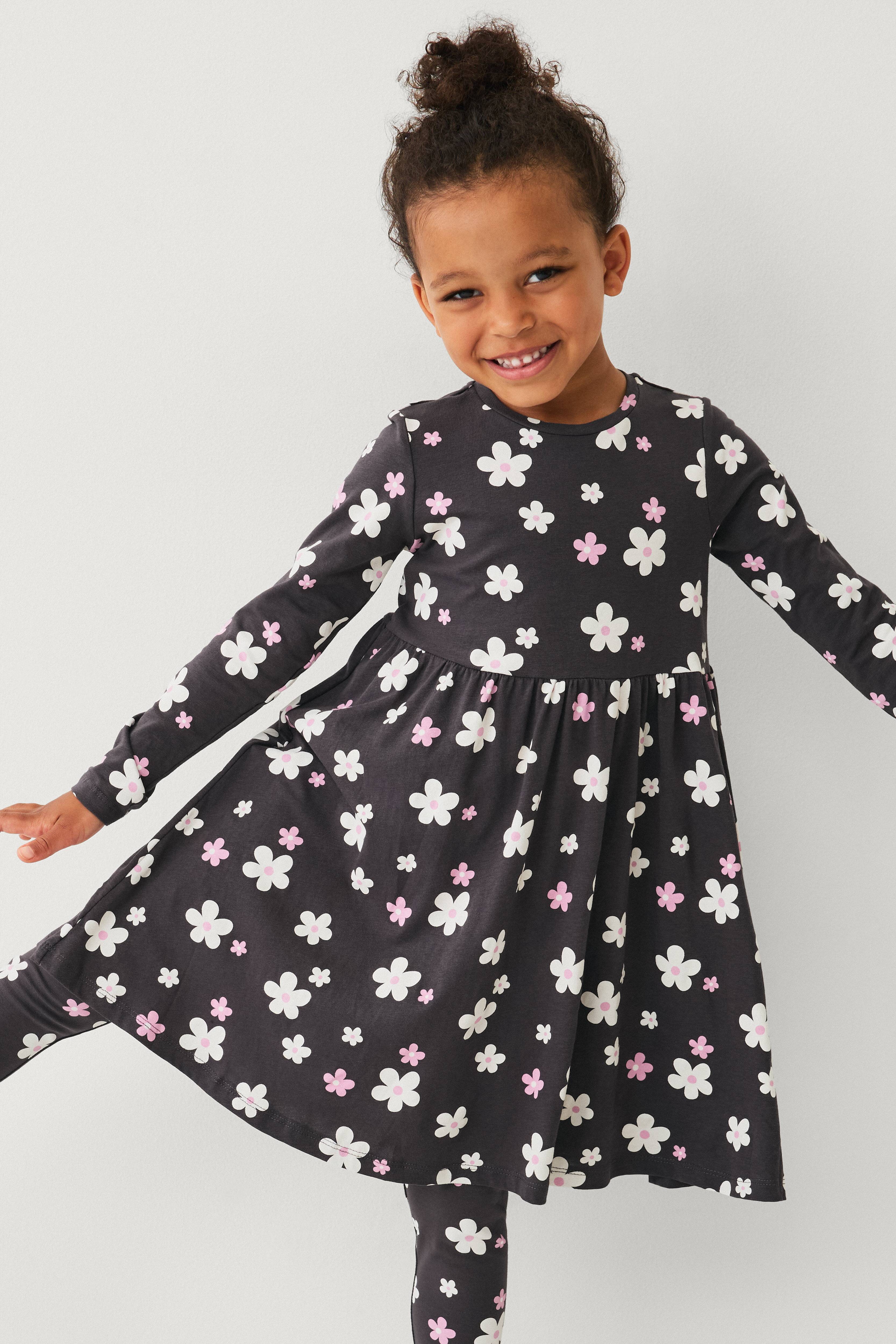 • Langermet kjole i myk bomullsjersey• Rund hals• Trykket mønster overalt• Rysje ved midjen