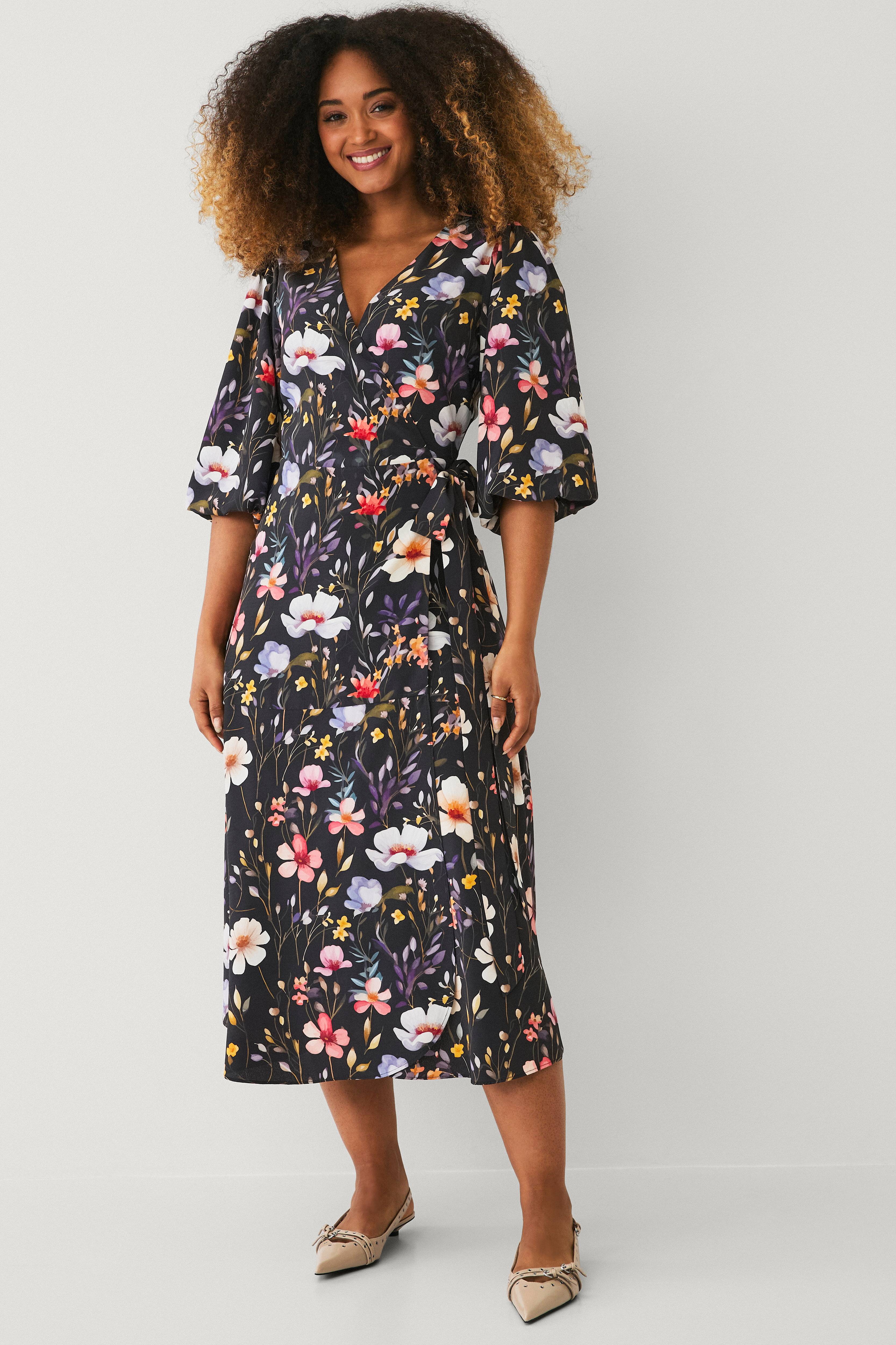 • Fôret omslagskjole i tynt, mønstret chiffon • Korte ballongermer med gummistrikk i ermeslutten • V-formet hals • Ettersittende passform med utsvingt nedre del • Innsnitt ved bysten • Liten i størrelsen, vi anbefaler at du velger en størrelse større enn din vanlige størrelse • Lengde: 125 cm i størrelse 36